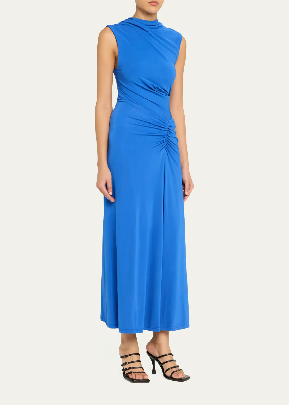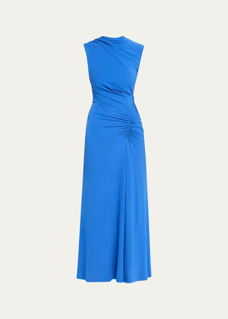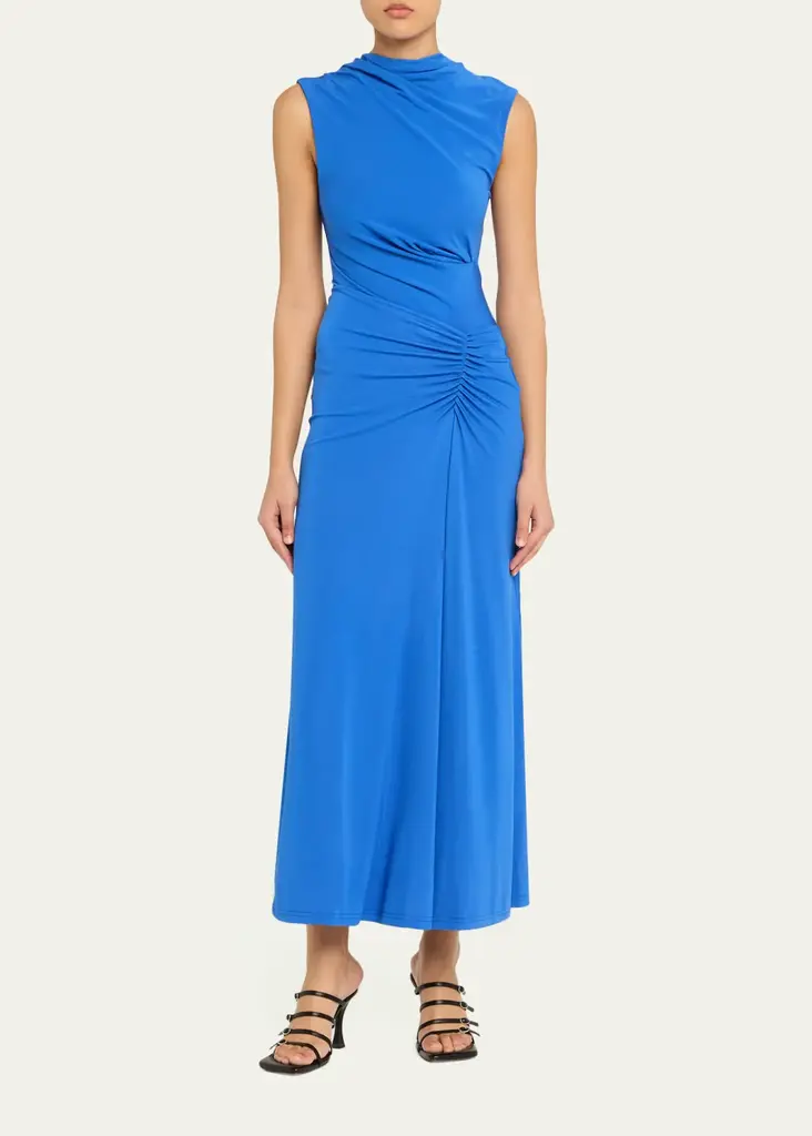 - SIMKHAI "Acacia" matte crepe dress adorned with soft gathering that flatters the waist