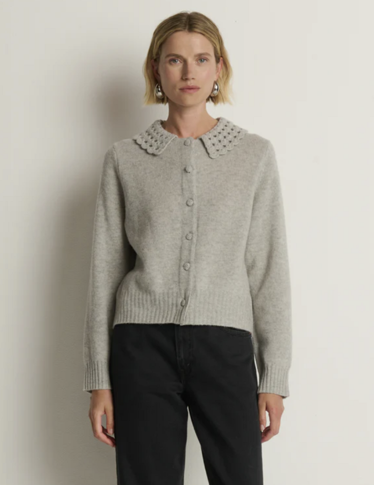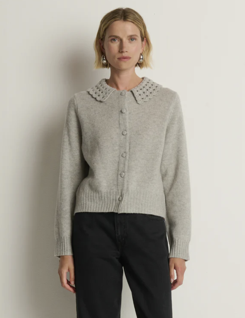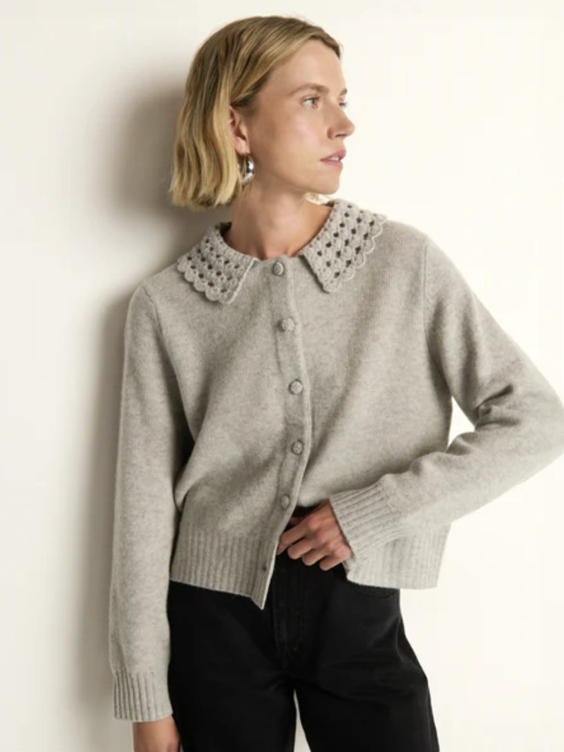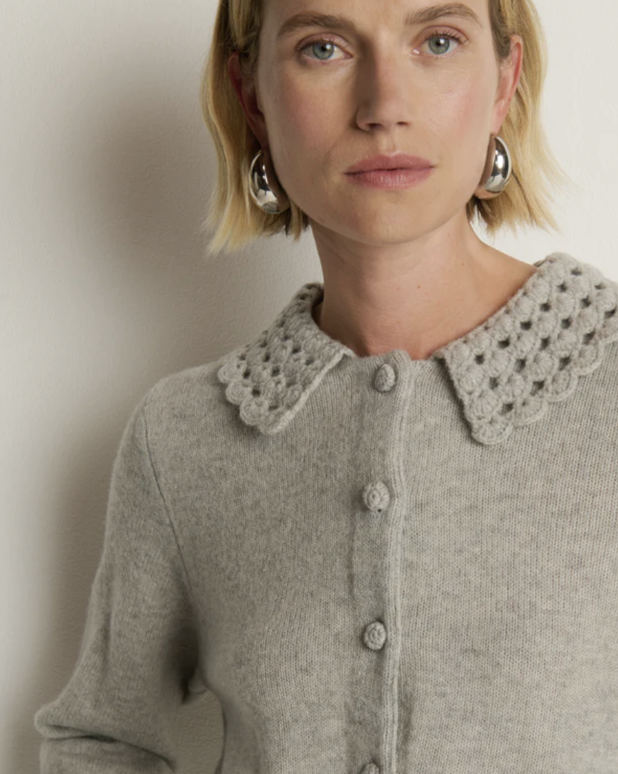 The Addie Cardigan wraps soft texture in effortless style—knit in 100% merino wool with a relaxed fit. A hand-crocheted Peter Pan collar and bishop sleeves bring subtle volume and refinement to a piece you can wear anywhere.