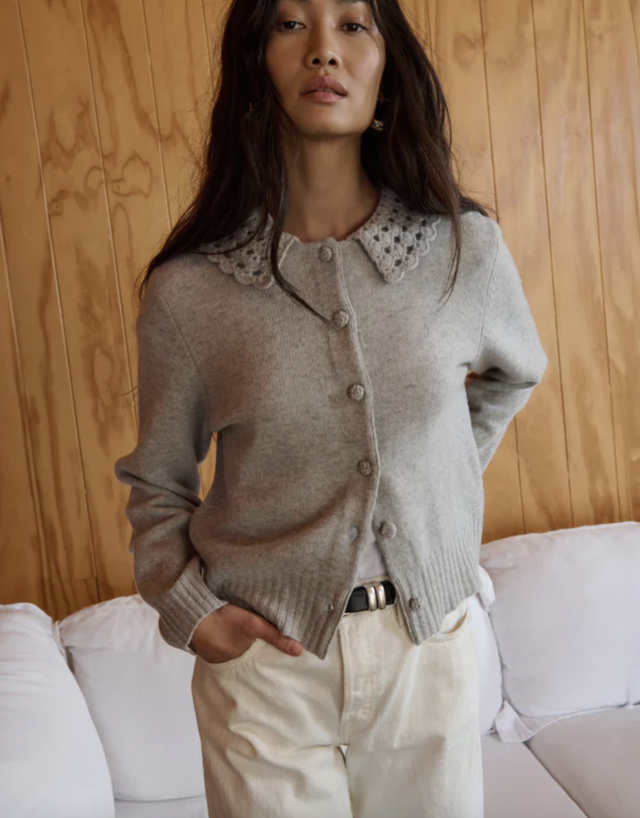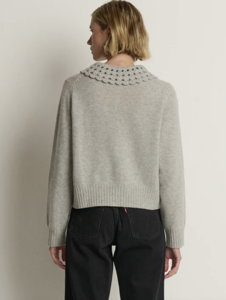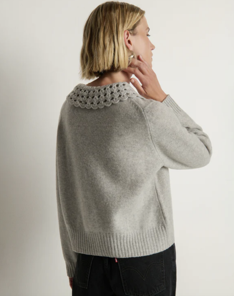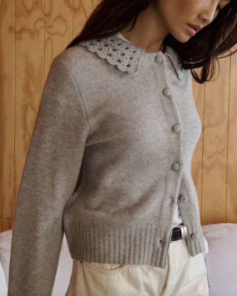 The Addie Cardigan wraps soft texture in effortless style—knit in 100% merino wool with a relaxed fit. A hand-crocheted Peter Pan collar and bishop sleeves bring subtle volume and refinement to a piece you can wear anywhere.