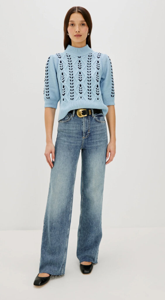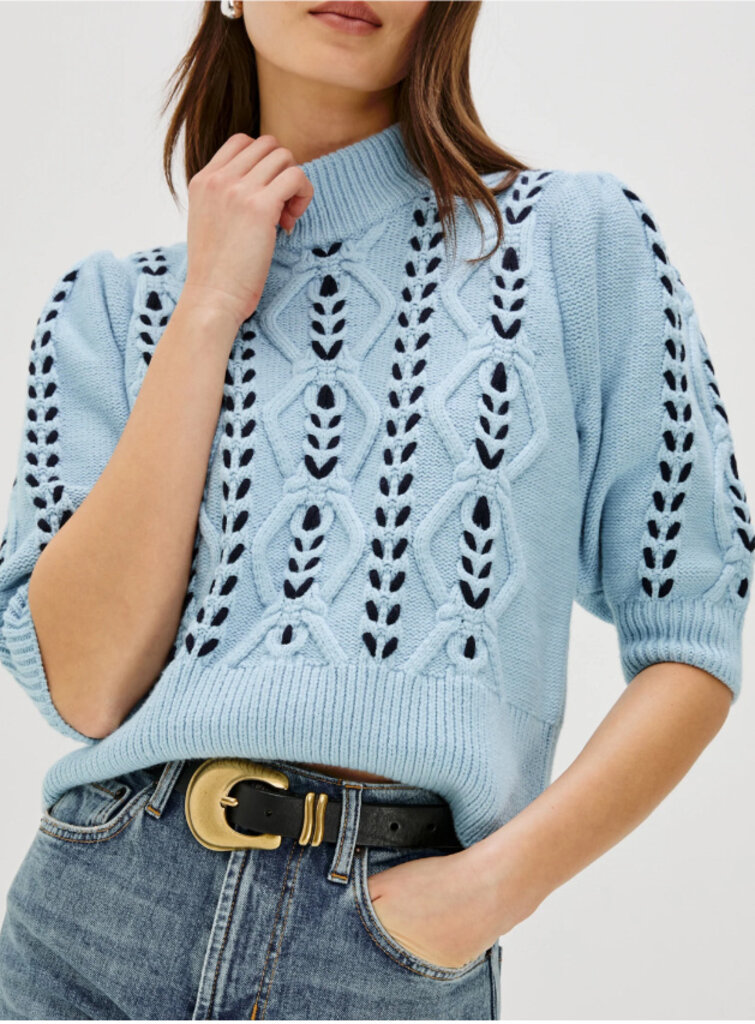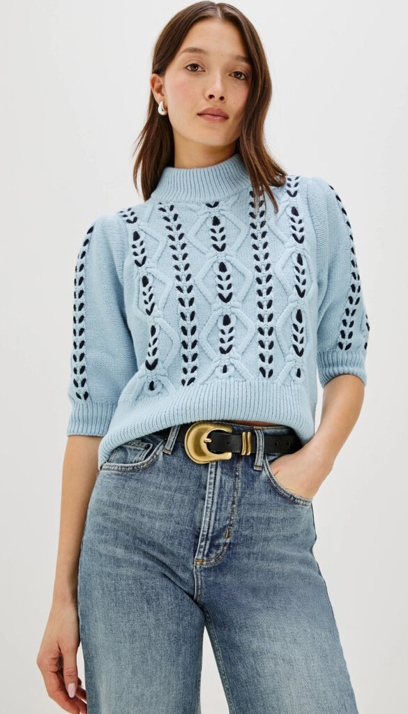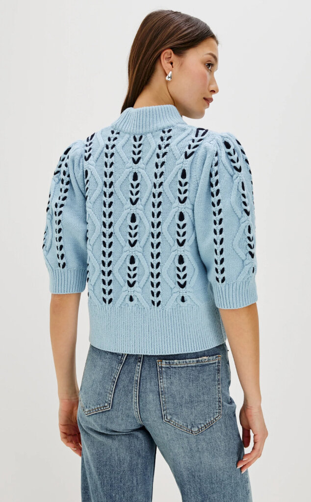 The Addy is a semi-fitted sweater with three-quarter sleeves and feminine knit detailing. Contrast cable weave, a mock neck, and ribbing at the hem complete the look.