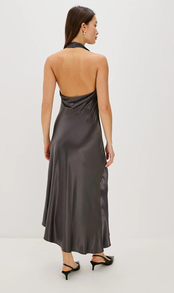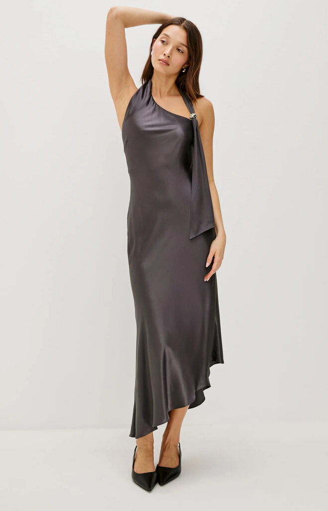 Slip into the Adra Dress, crafted in luxe satin crepe with a body-skimming fit. It features an asymmetric hem, scarf detail, and halter neckline with metal hardware detailing.