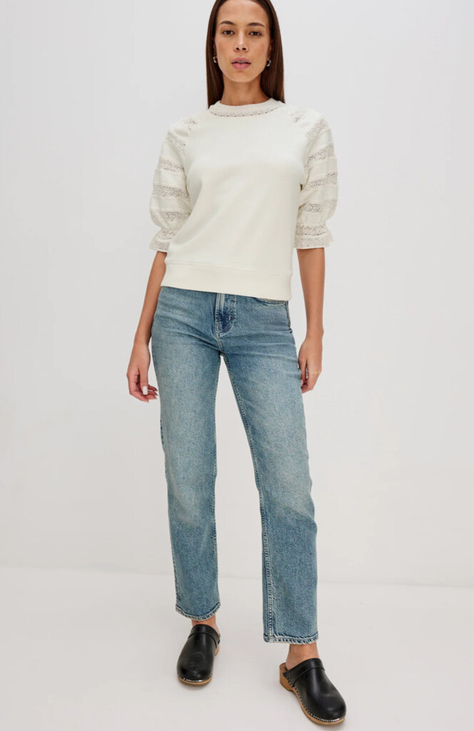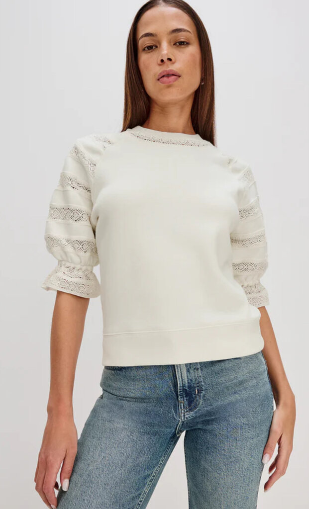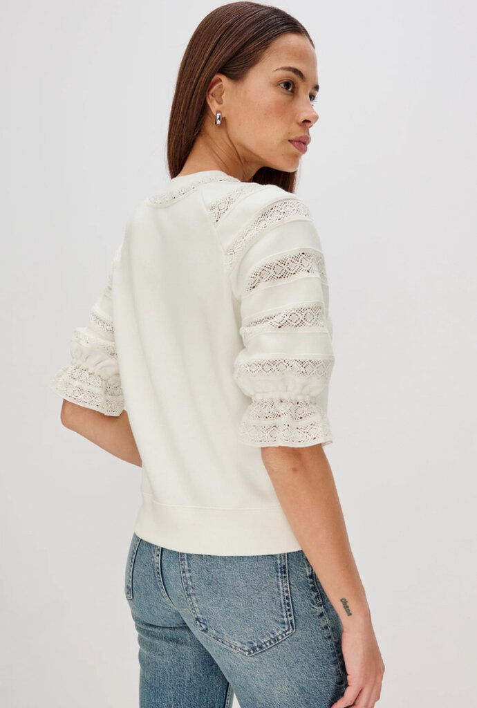 The Aggy is a luxe French terry sweatshirt with a relaxed, comfortable fit. Inset cotton lace and ruffled sleeves lend a soft, feminine touch.