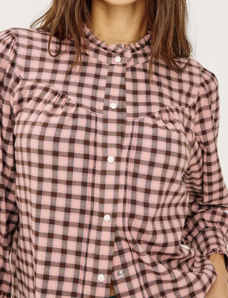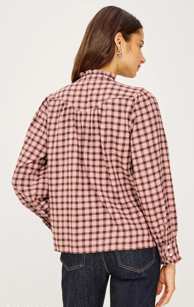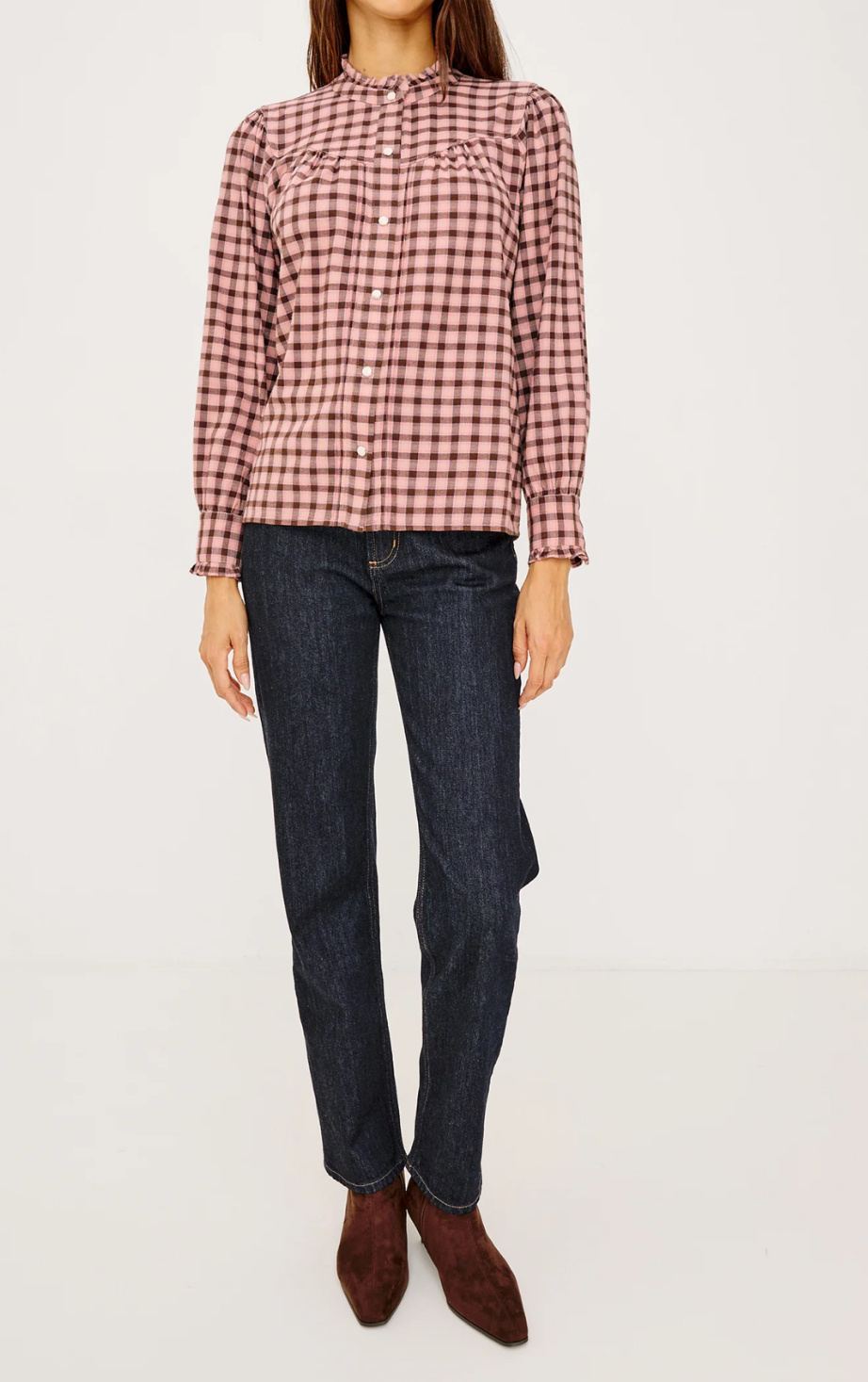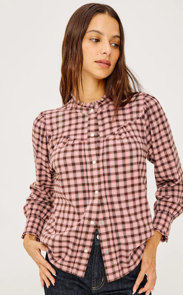 The Alanna offers a feminine twist on the classic shirt. Made from midweight brushed cotton blend, it combines comfort with refined details like a curved yoke seam, a ruffled collar and ivory snap buttons.