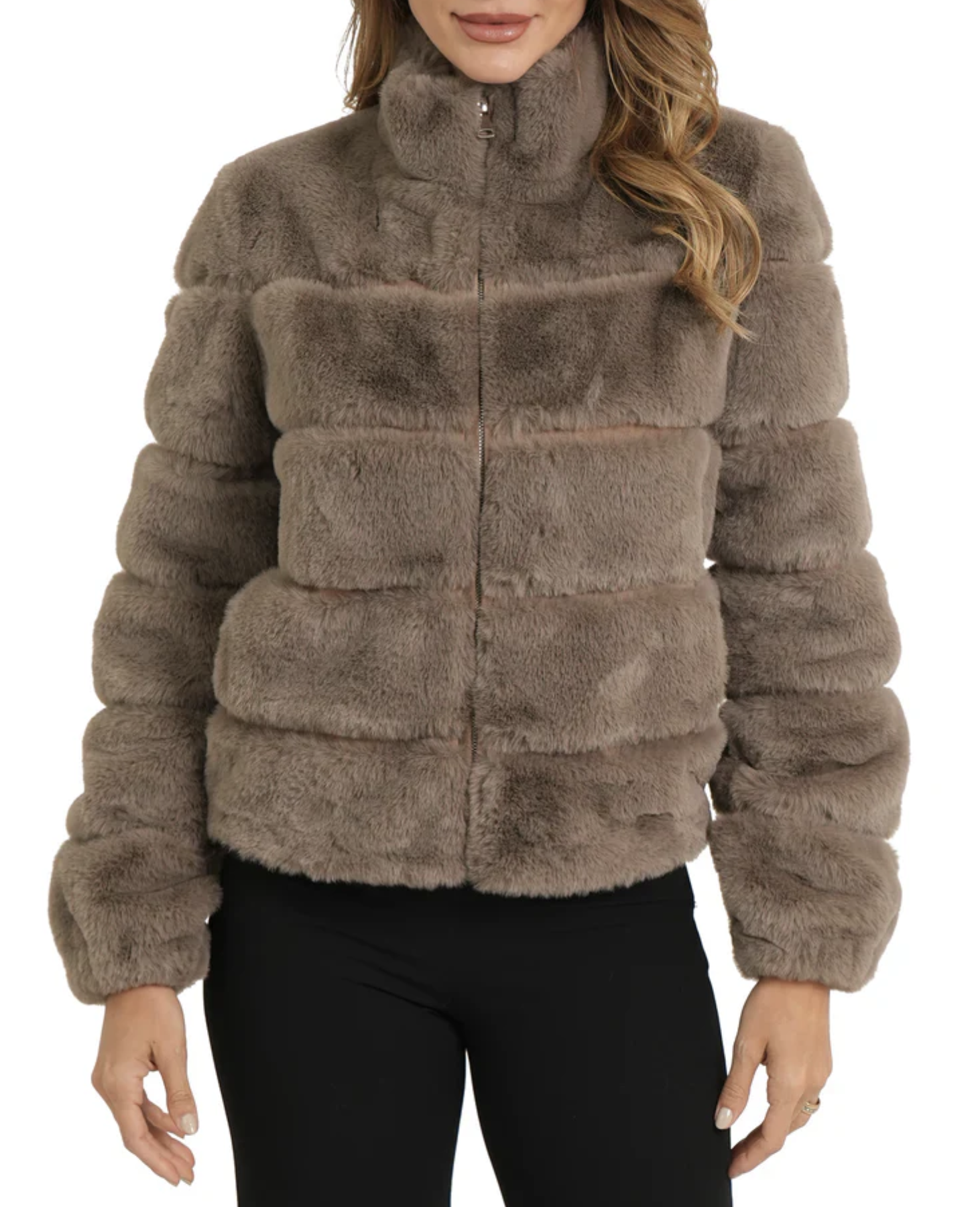 Love Token's show stopping faux fur jacket makes a come back in a wide range of head turning colors. Full zip front with a stand collar, and two working slit pockets.
