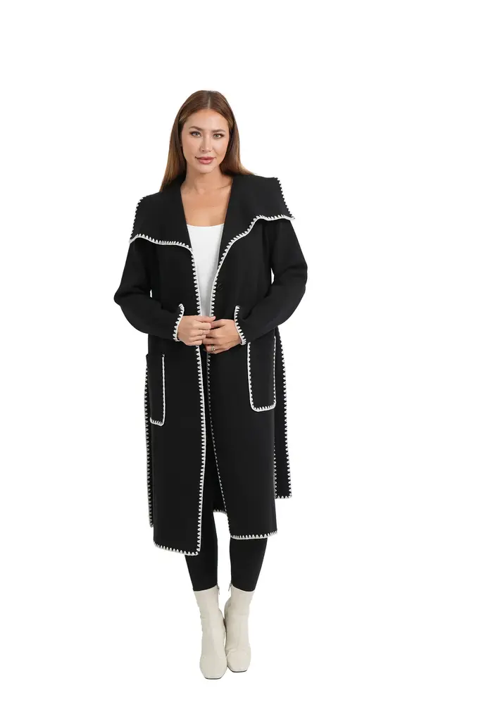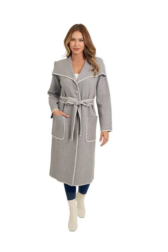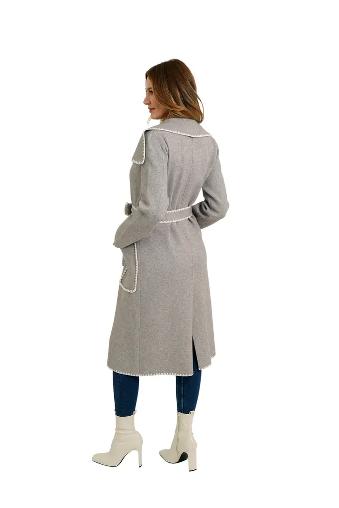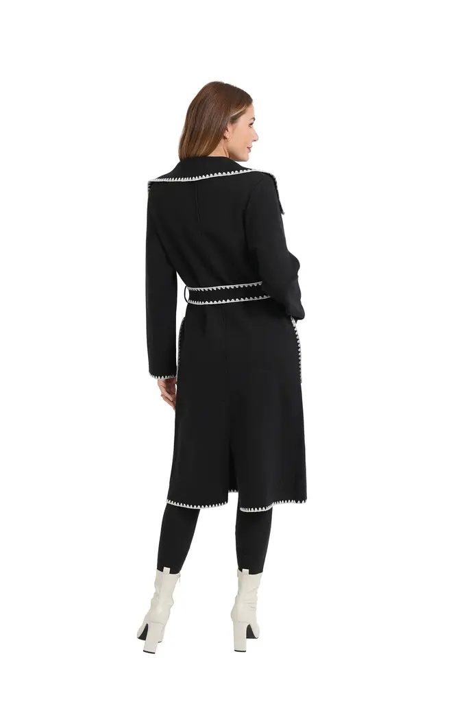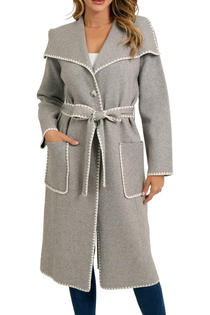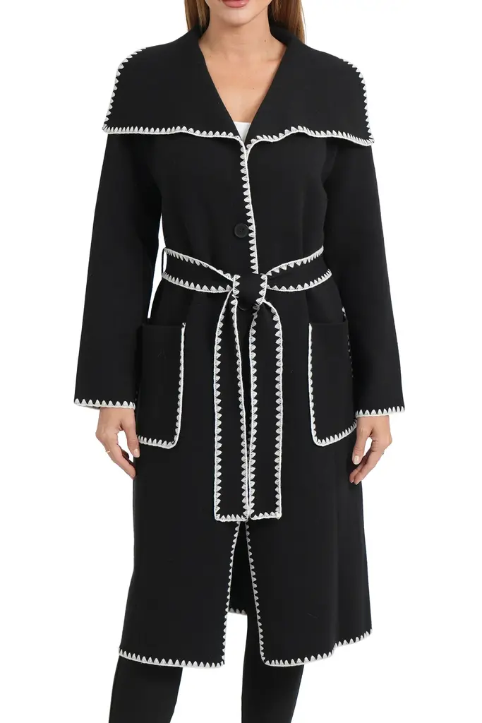 Allen tailored cardigan with embroidery, sailor collar, front button closure, 2 front patch pockets, wrap belt, relaxed fit.