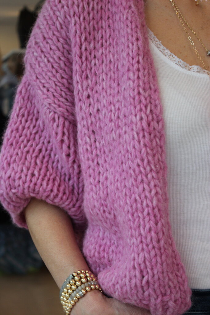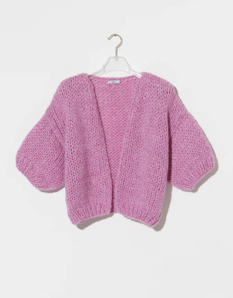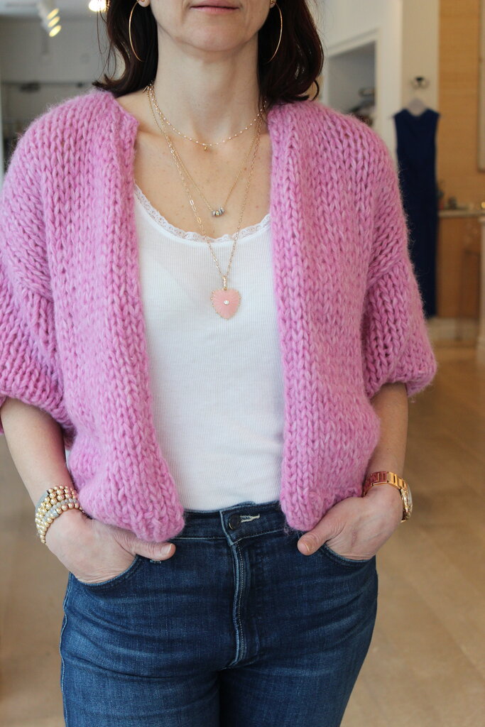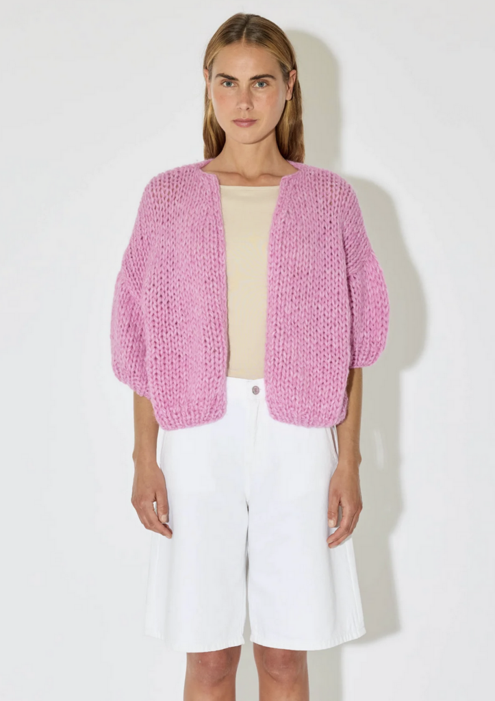 The Alpaca Bomber Cardigan by Miami is a soft, textured knit in a beautiful pink melange. Designed with a relaxed bomber silhouette and short sleeves, this alpaca blend cardigan delivers cozy warmth with a modern, effortless feel.