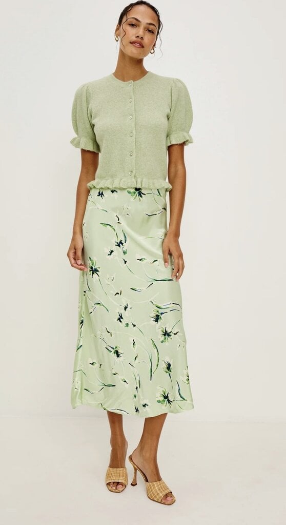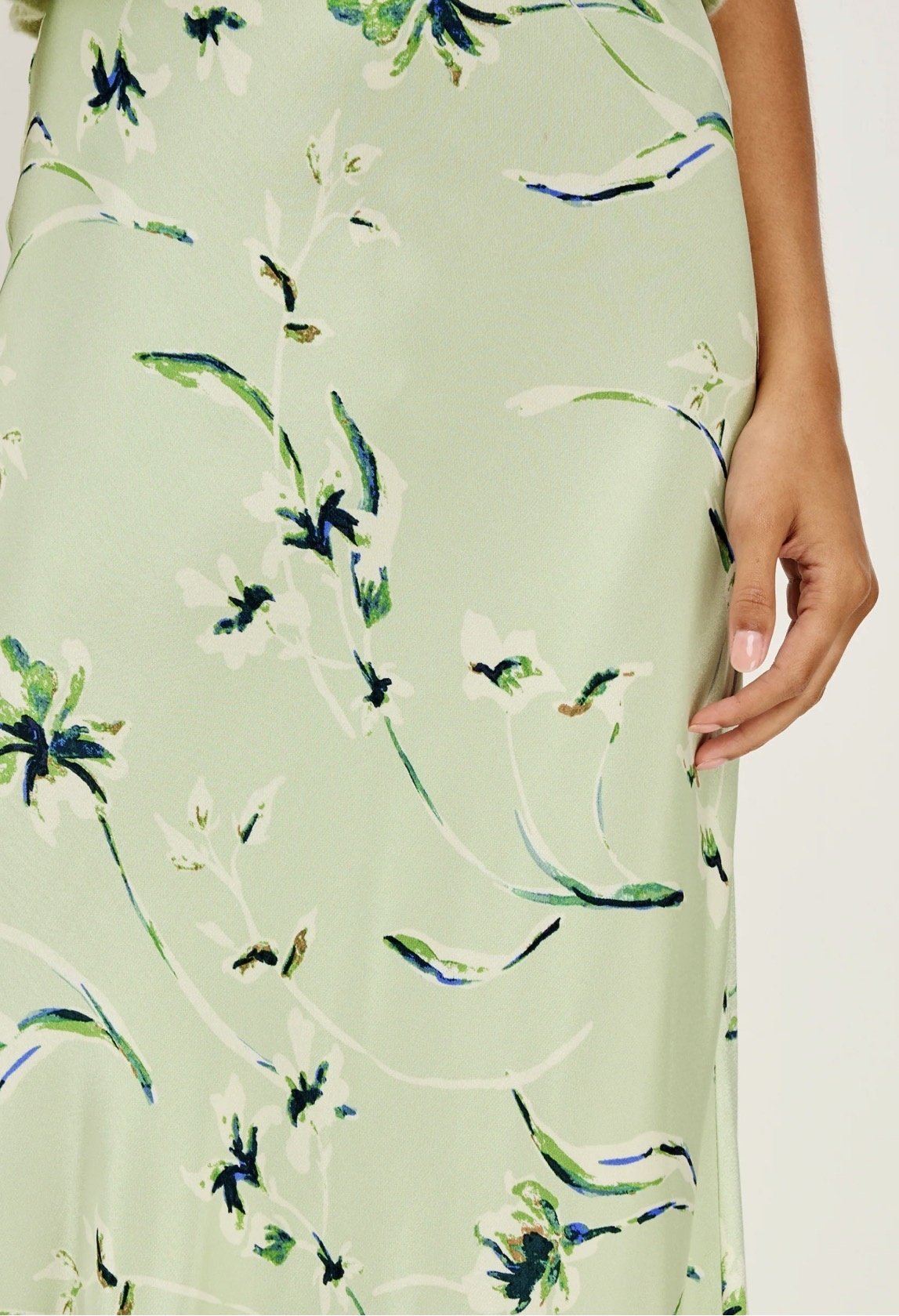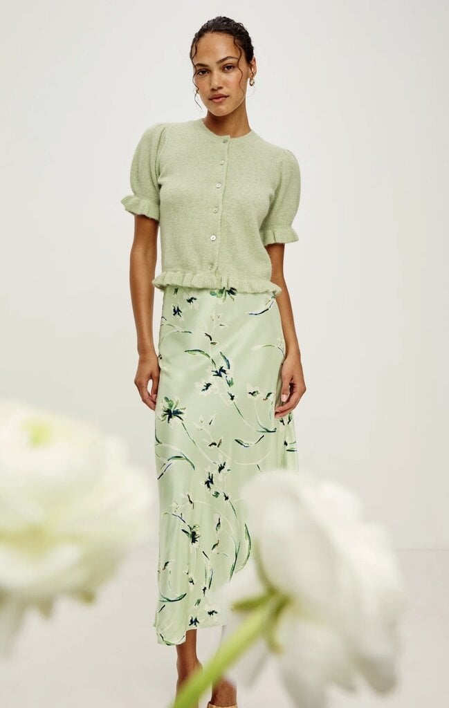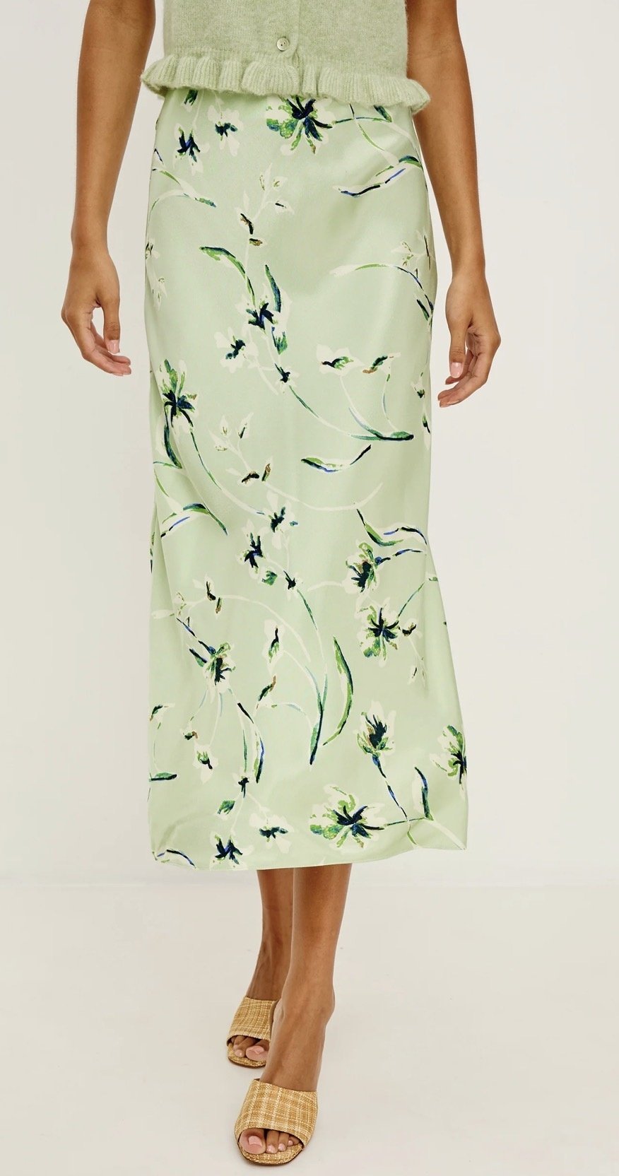 Rails Anya Skirt. Flirty bias-cut midi with high-rise fit and soft floral satin-back crepe, perfect for spring weekends and garden gatherings.