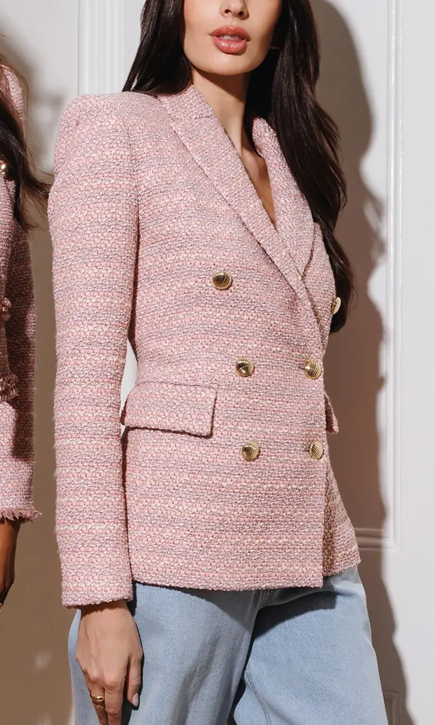 The Arielle Tweed Blazer brings polished elegance to any look. Designed in a pink multi tweed with gold buttons and a double-breasted silhouette, this tailored blazer delivers refined structure with a feminine twist. Perfect for pairing with trousers, denim, or the coordinating skirt for a full set moment.