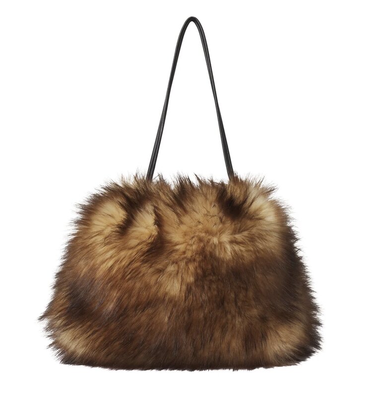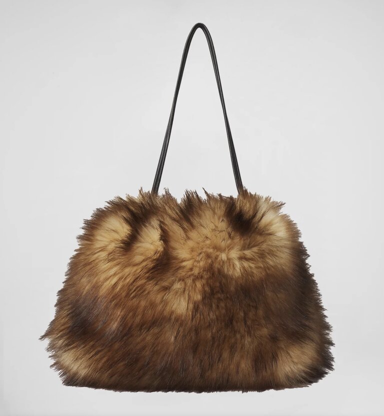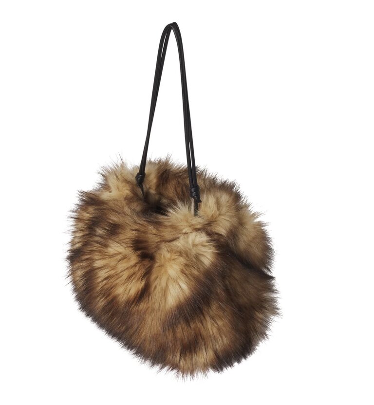 The Arlo Bag is crafted from plush faux fox fur in a rich blend of warm brown tones with soft black striping for dimension. This softly structured silhouette features a gathered top and a thin leather shoulder strap—striking the balance between cozy and statement.