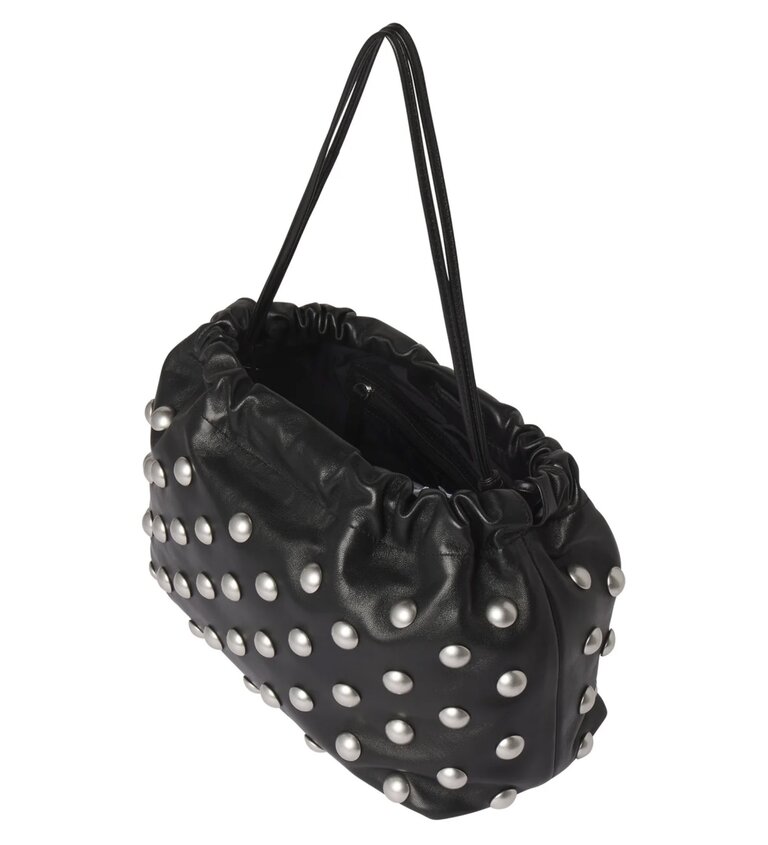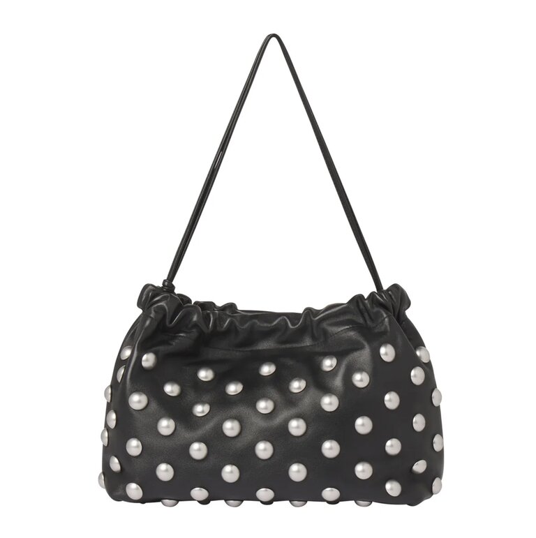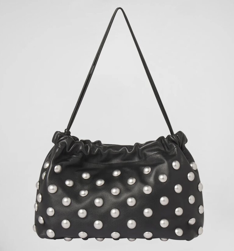 The Arlo Bag is crafted from buttery-soft lamb leather in timeless black, punctuated with silver dome studs for a bold, modern effect. This shoulder silhouette features a softly ruched top and a slender adjustable strap, blending structure and slouch for a versatile statement.