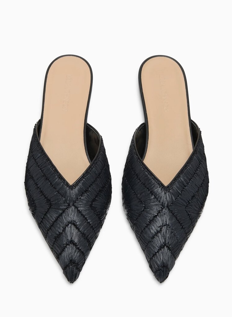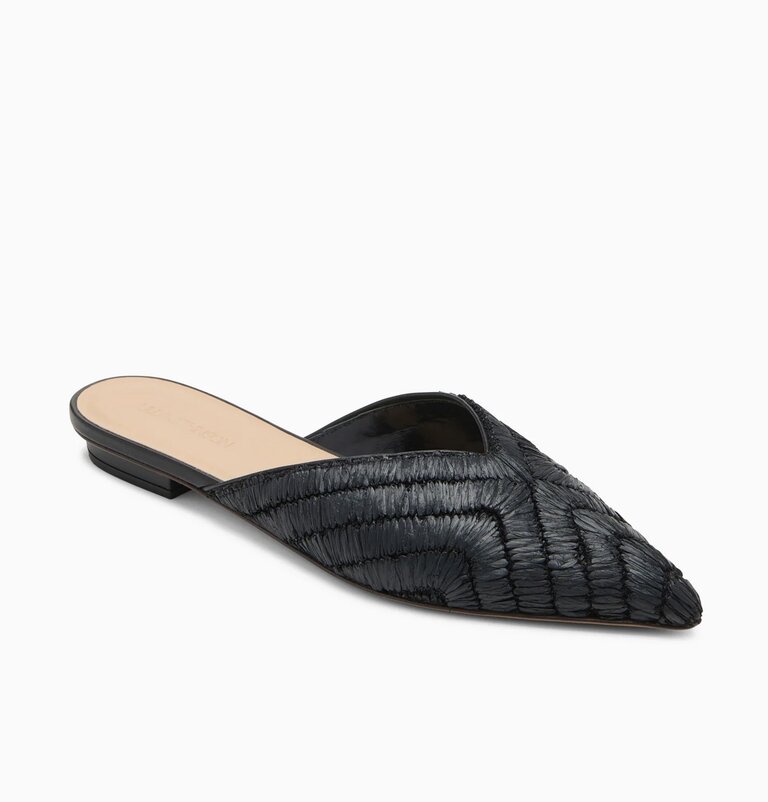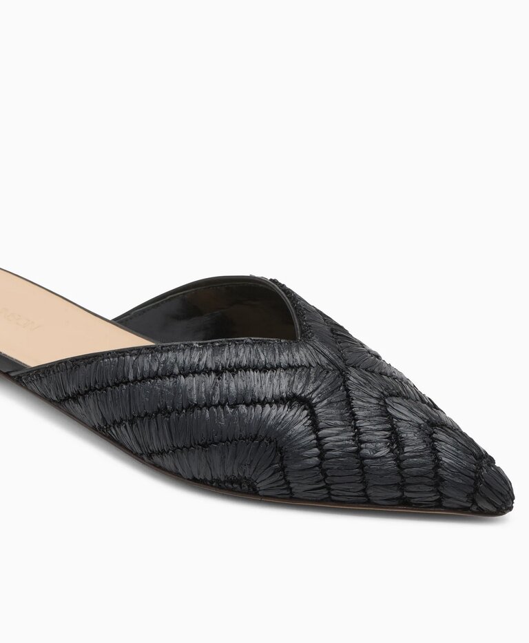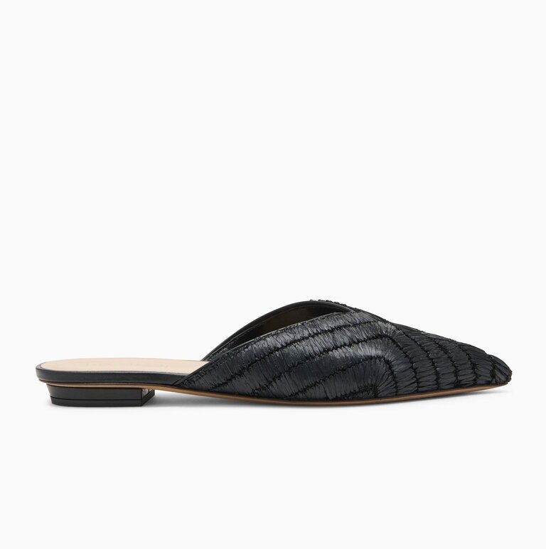 The perfect everyday shoe, the Aunika Mule is intricately woven in Italy from raffia in black for elegant versatility. It tapers to a sleek pointed toe, is lined in calfskin, and has a flat sole for wear-everywhere comfort.