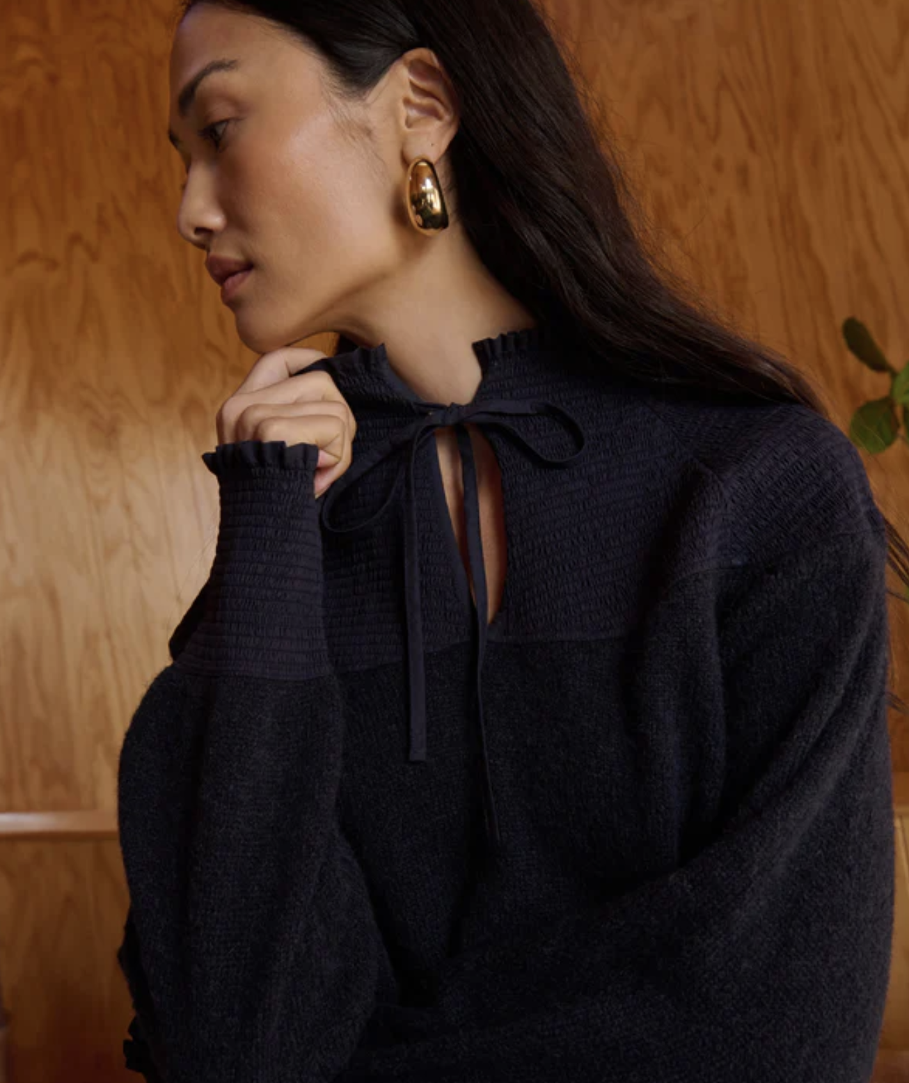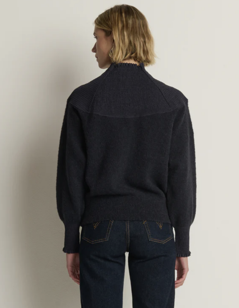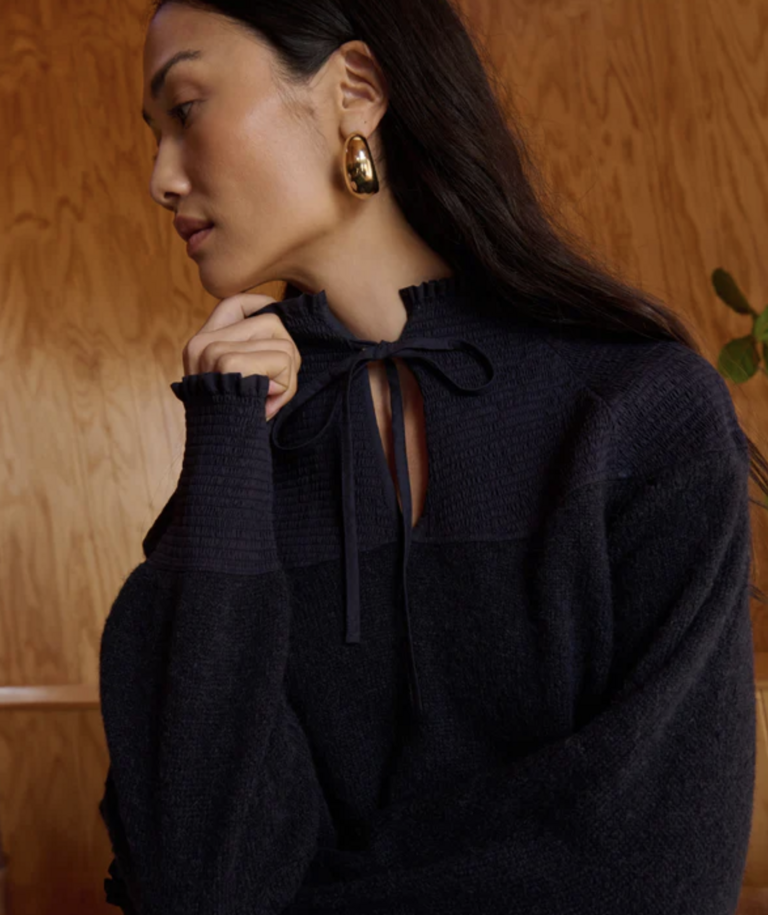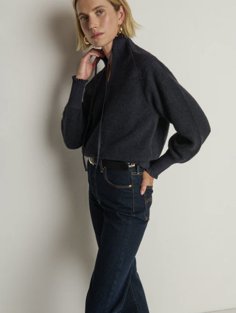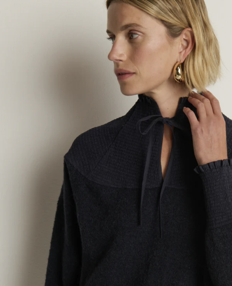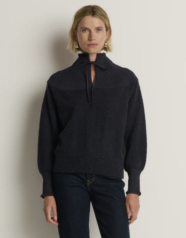 One piece you’ll never want to take off—the Babette Sweater, a luxe layering essential made of brushed Caraveli alpaca in a relaxed pullover fit. A funnel neck, bishop sleeves, smocked cuffs, and a contrast-woven yoke add soft volume and gentle warmth.