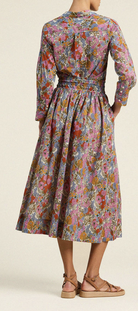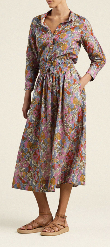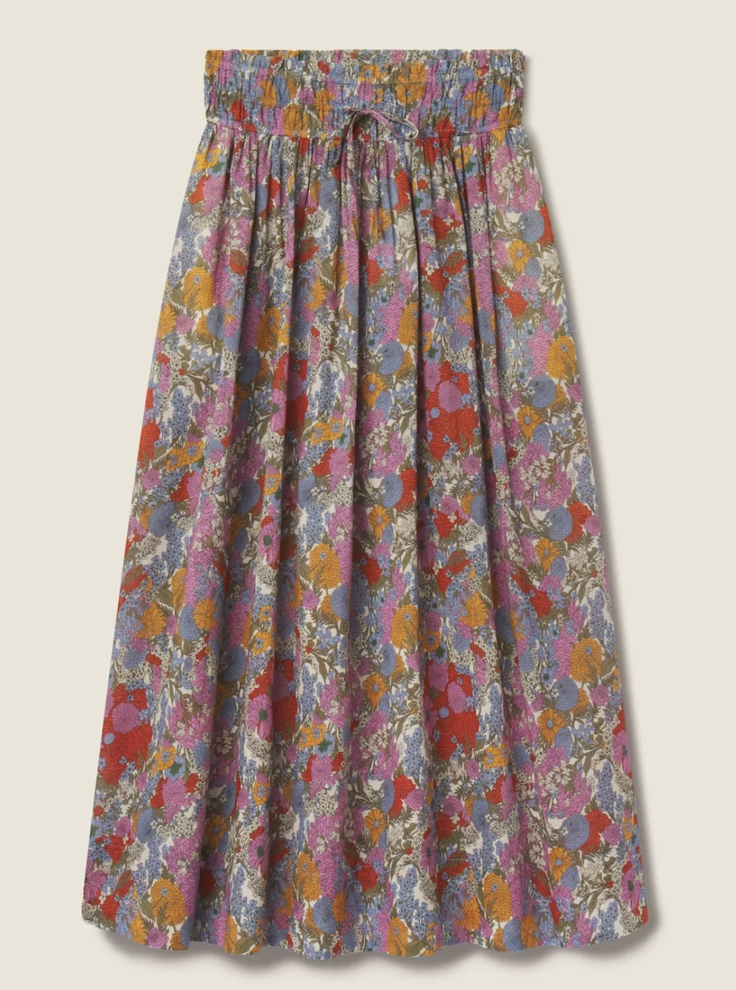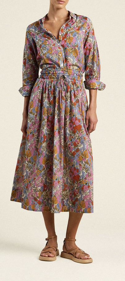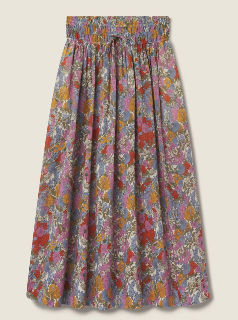 The Bianca Skirt is a billowy, midi-length style with a smocked elastic waistband and seamed gathers at the hips that release into a sweeping hemline.