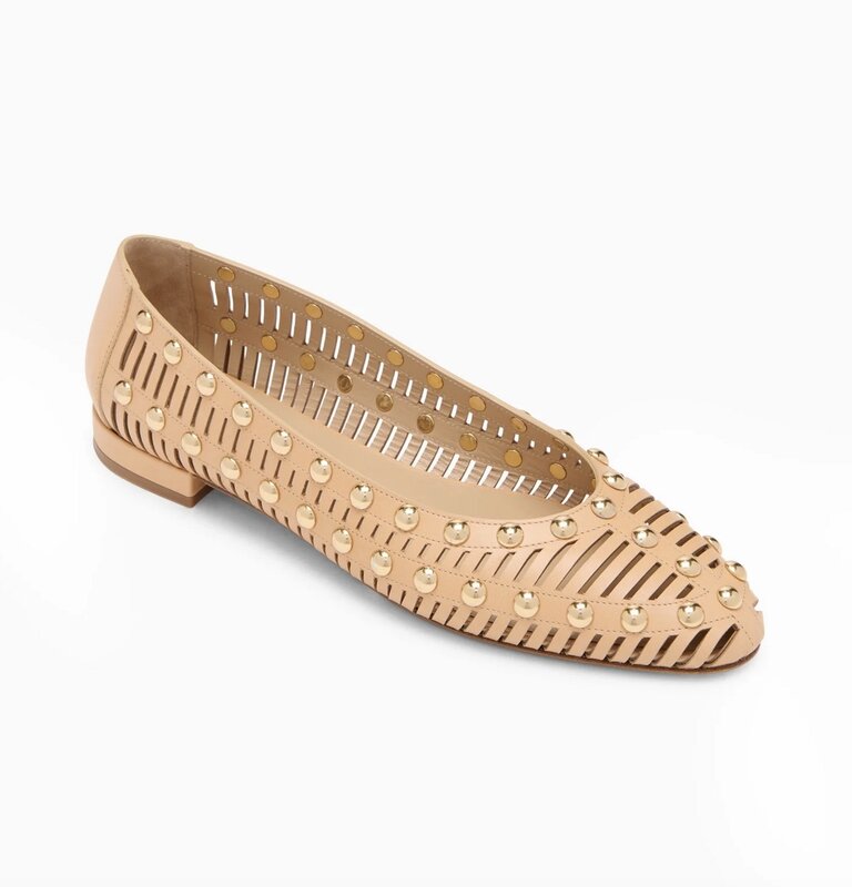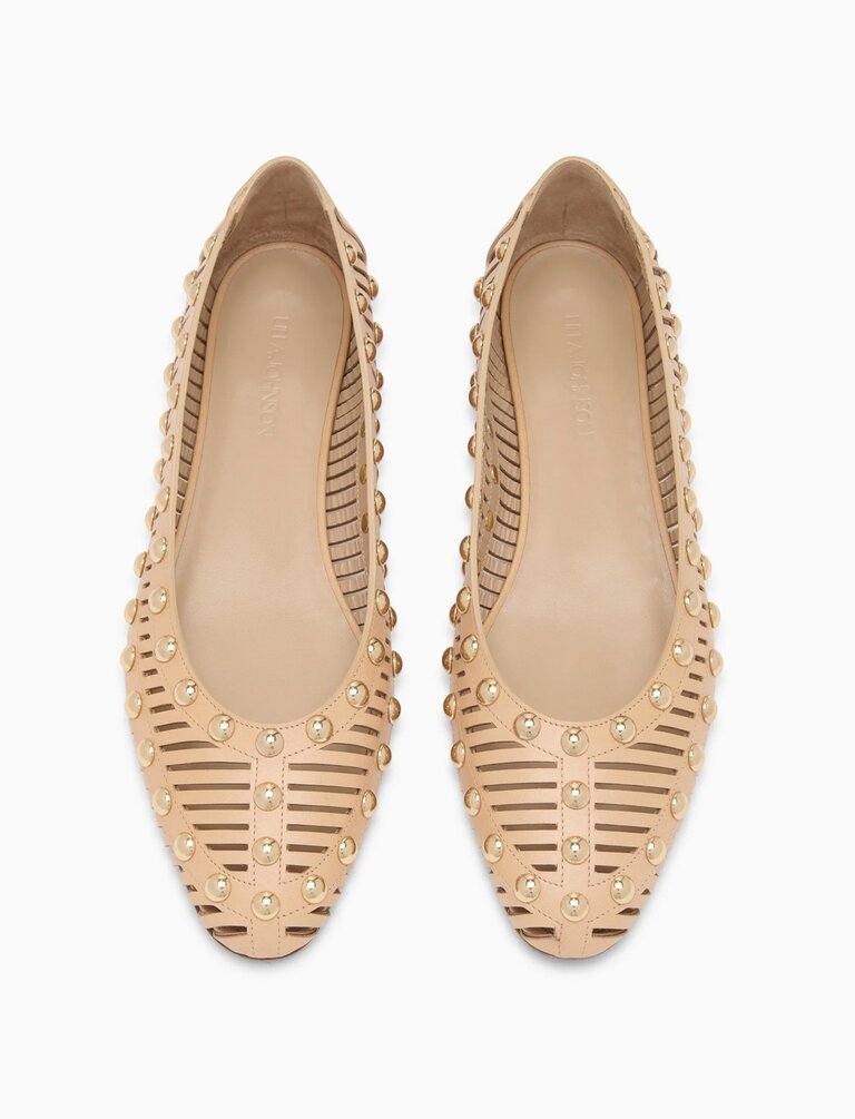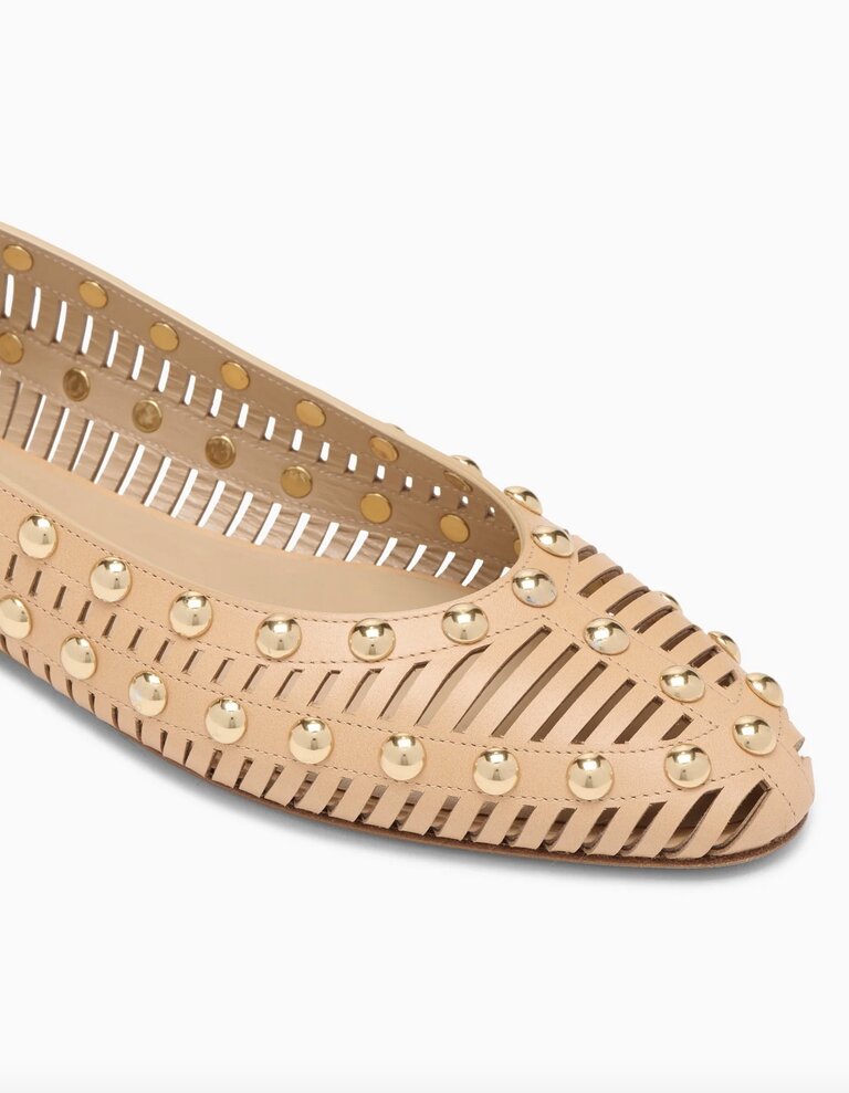 Crafted in Italy from smooth leather, our Bijou Ballerina has an artfully caged construction that’s embellished with gilded studs. This classic ballet flat has an almond-shaped toe and is a light khaki shade that complements our ready-to-wear.