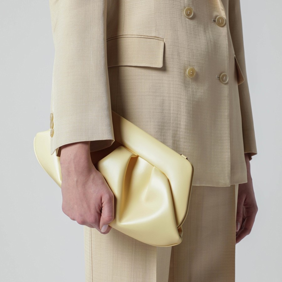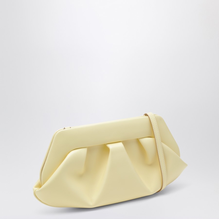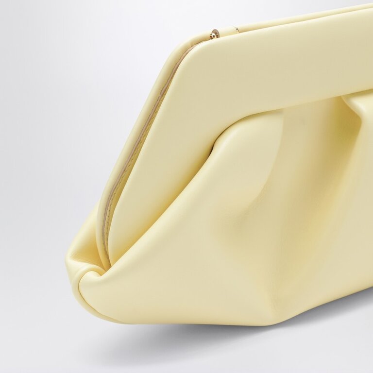 THEMOIRÈ clutch in pastel yellow eco leather, featuring double magnetic closure, removable shoulder strap, fabric lining, internal card slot pocket and gold-tone metal hardware.