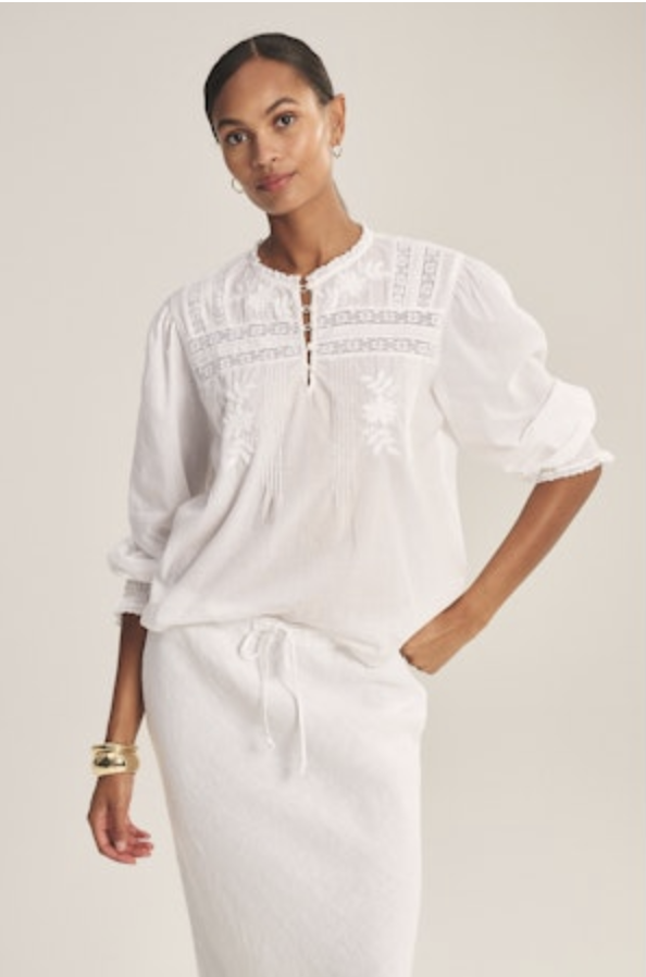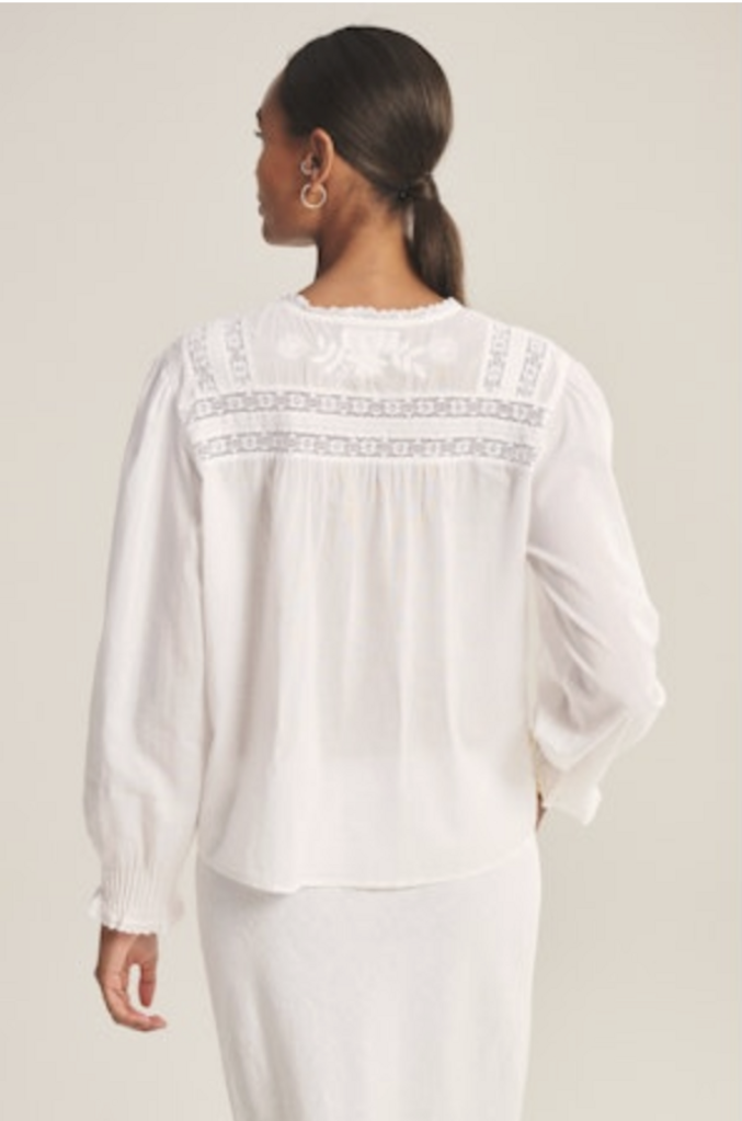 - Pintucks at yoke with floral embroidery and lace insets