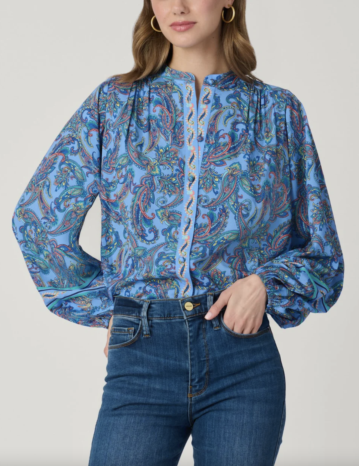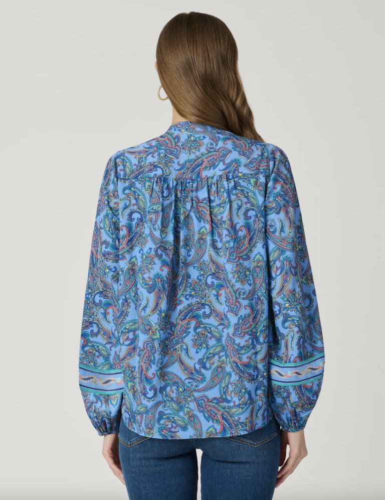 Button-front blouse with relaxed fit. This style features covered shank buttons on the front placket, and combo border placement at the placket and sleeves. Full length balloon sleeves with elastic casing at the opening. Side slits at the hem. Unlined.