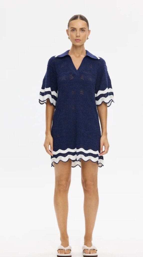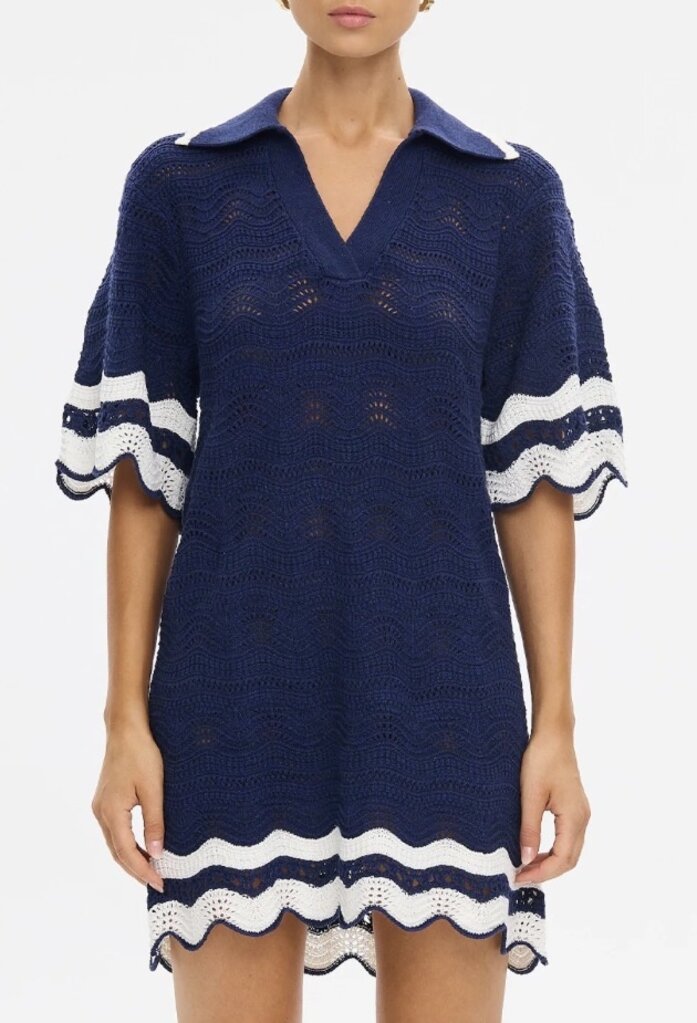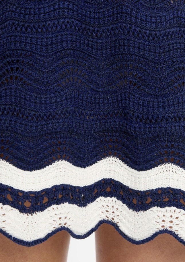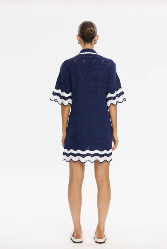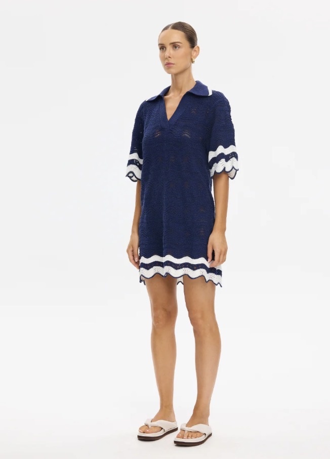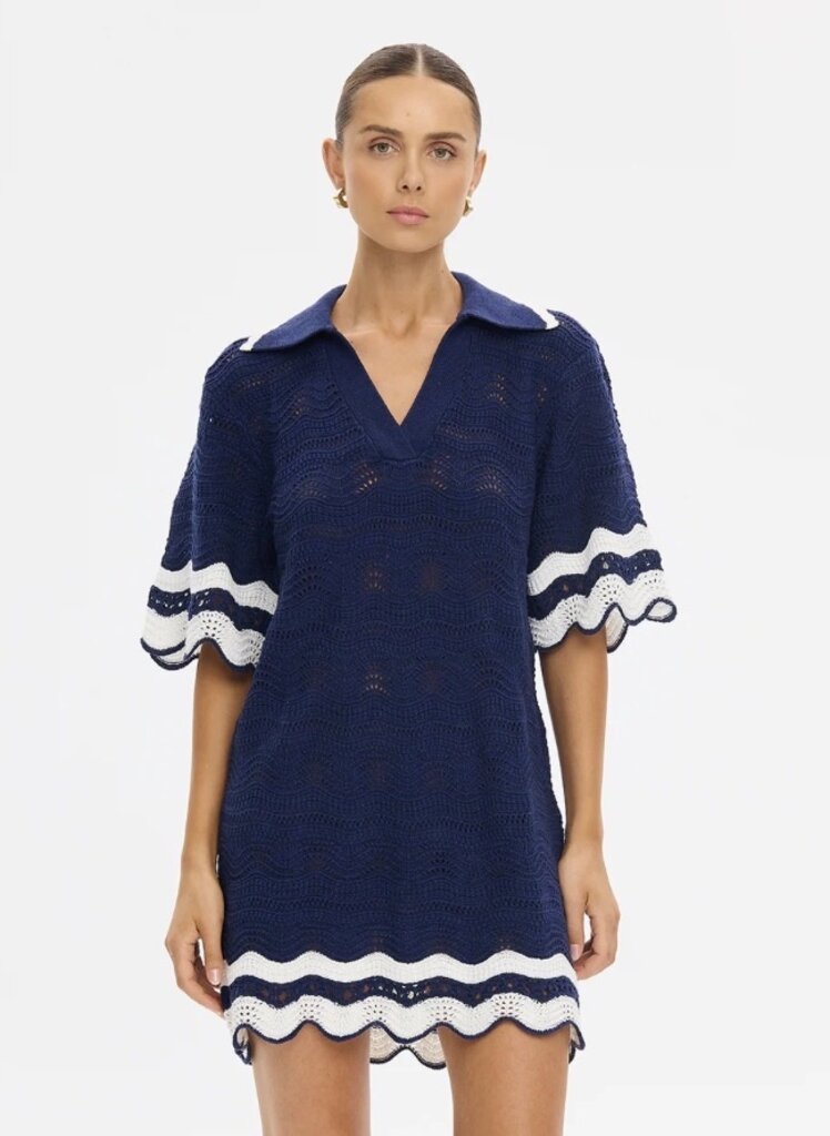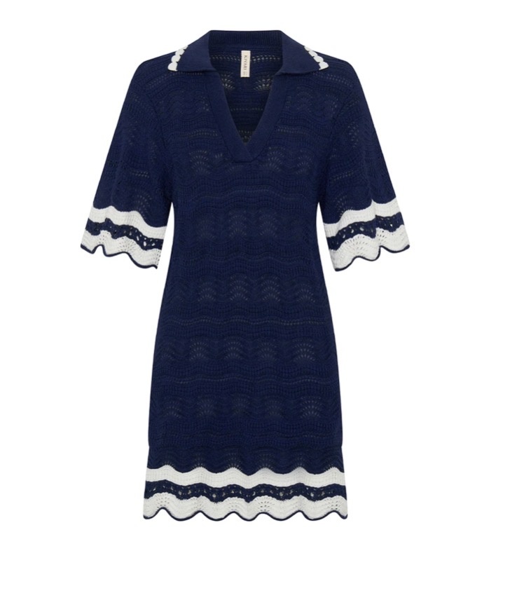 A V-neckline with fold-over collar detailing and elbow-length sleeves. Finished with contrast crochet trim, it brings texture and ease to this relaxed knit style. Ideal for long lunches, relaxed weekend outings and effortless dressing.