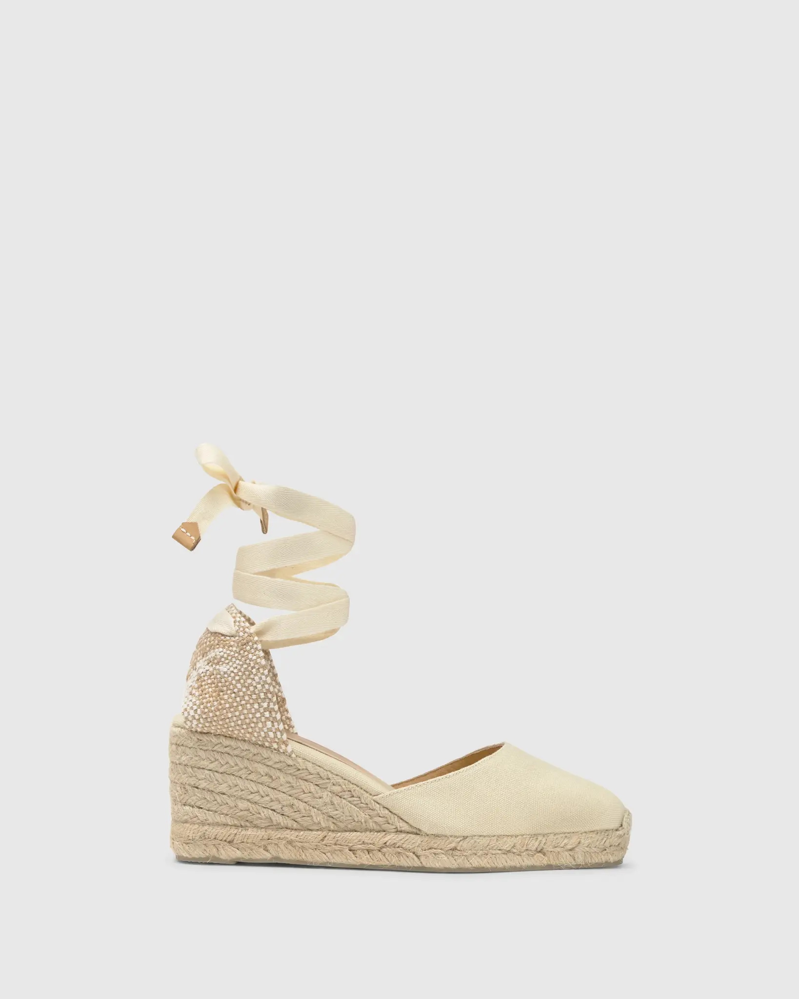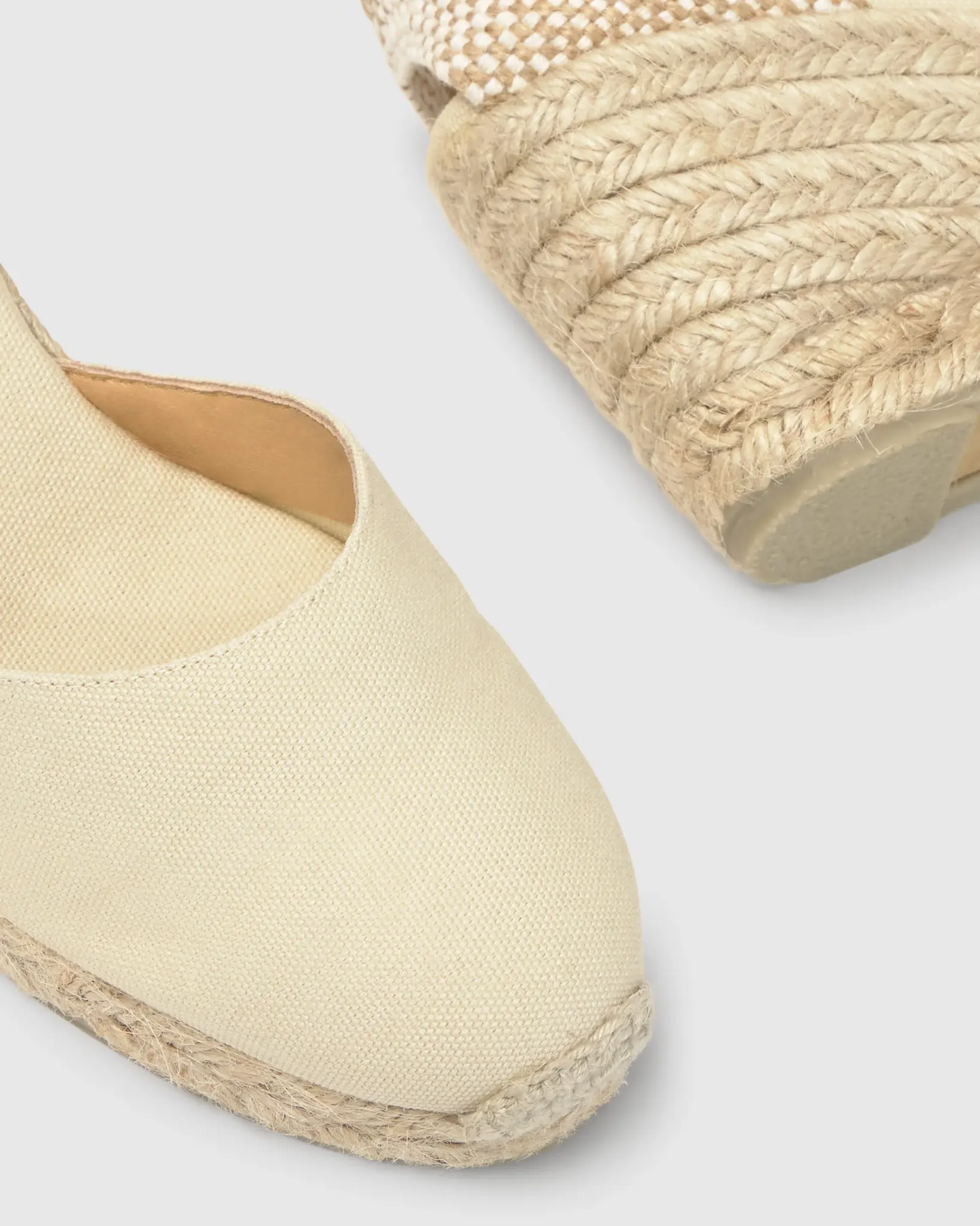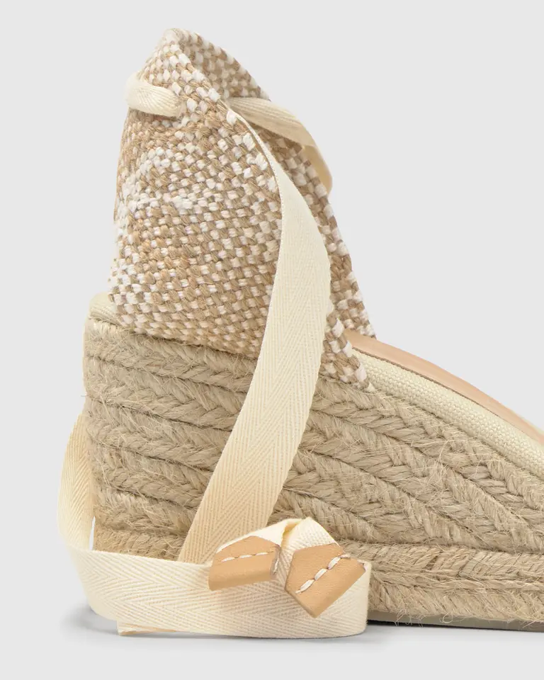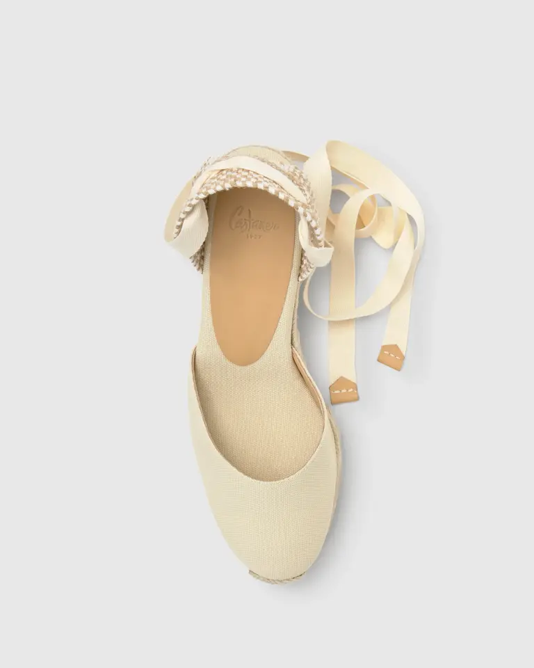 Iconic Carina espadrille in organic cotton with straps closure, cushioned insole and 7 cm jute wedge.