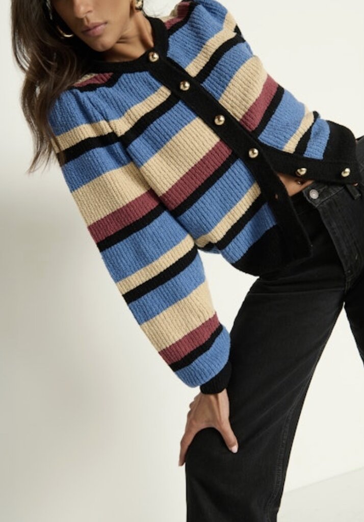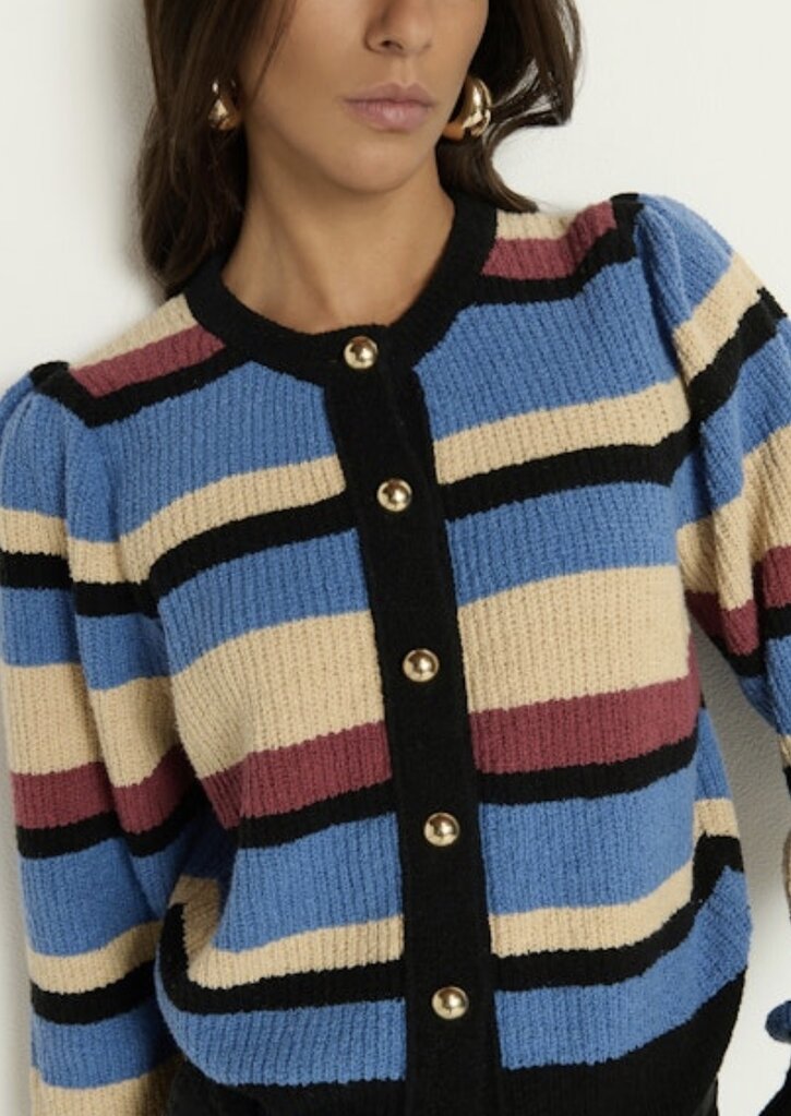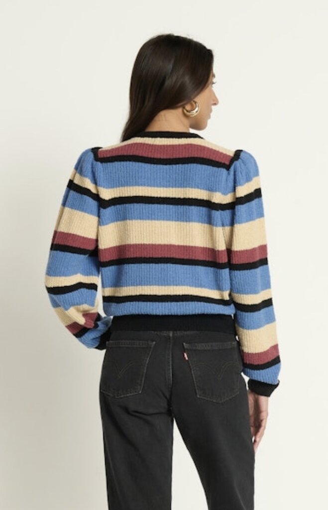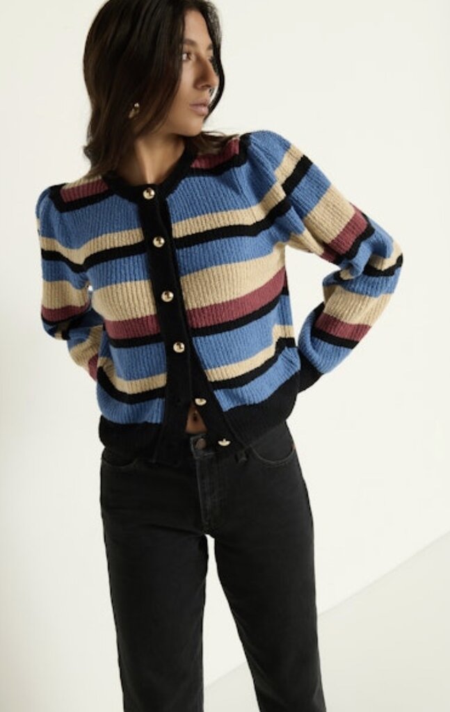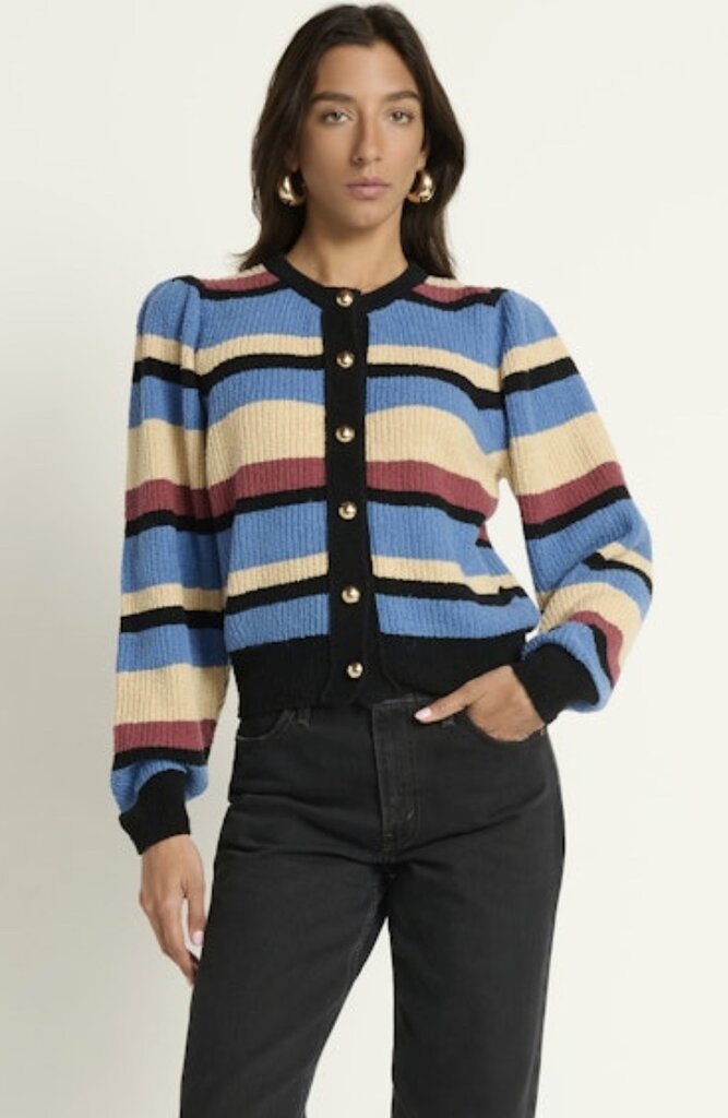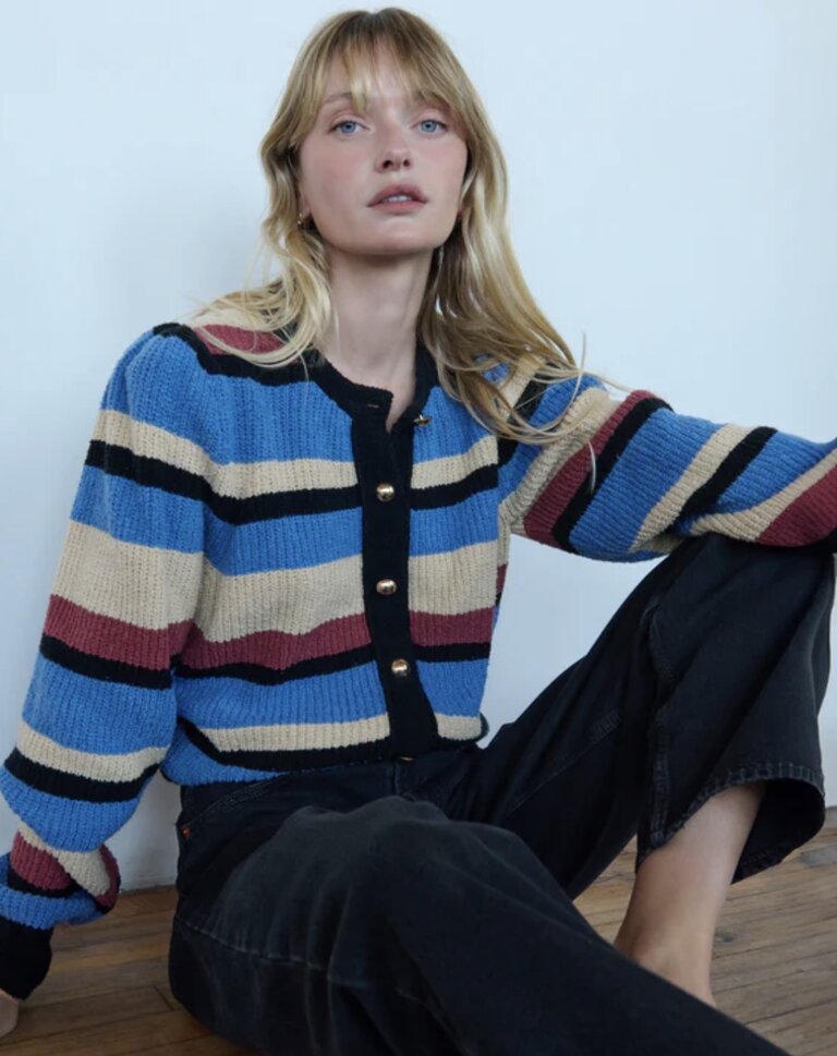 A casual yet chic cardigan that you'll return to year after year. Knit from our plush Pima Velour, the Carmela has a relaxed fit, crew neck, bishop sleeves, and dome gold buttons. This one comes in Velour Multi Stripe.