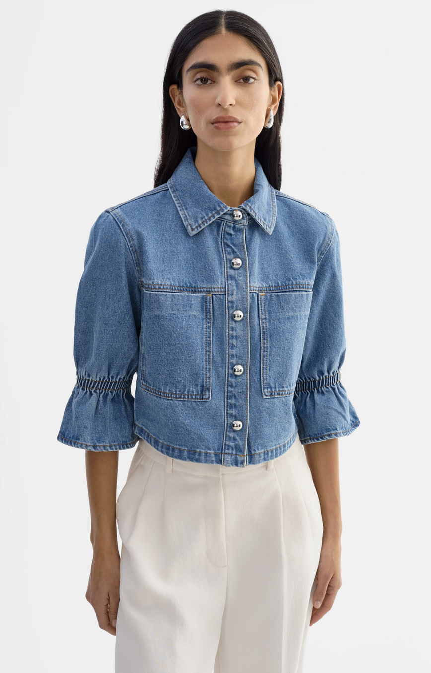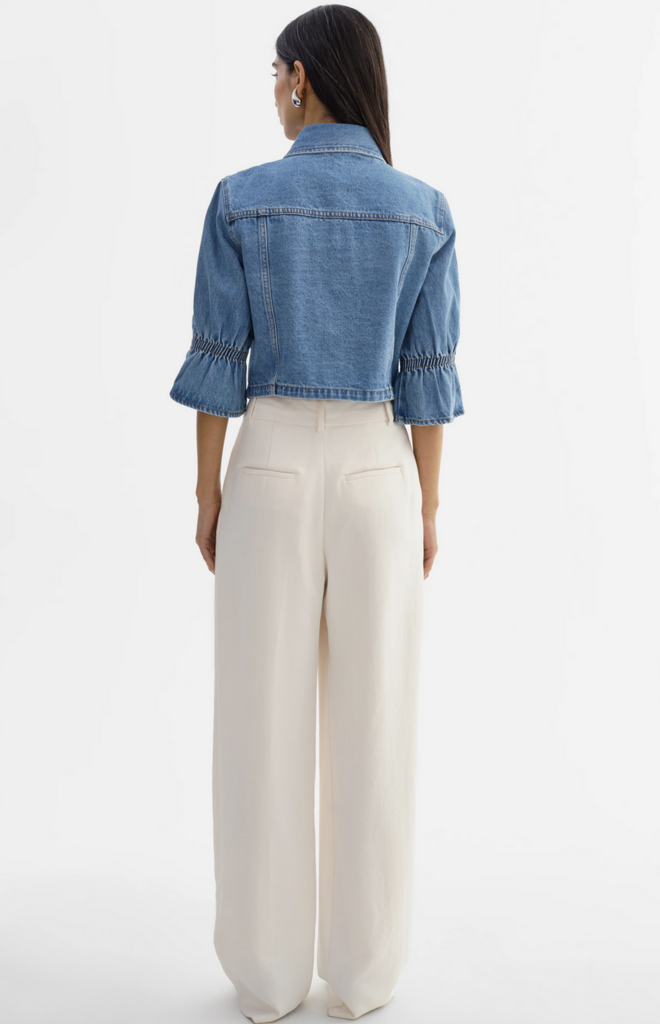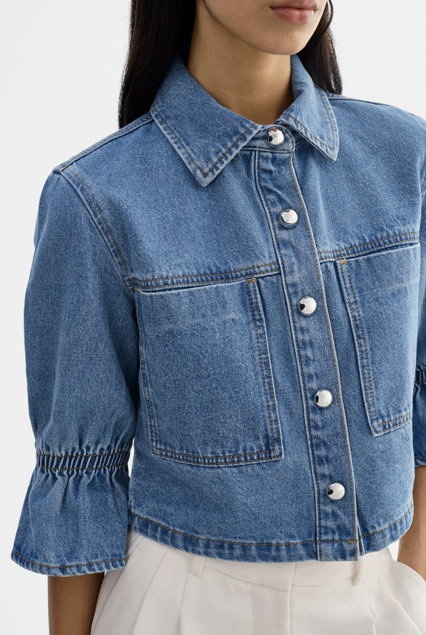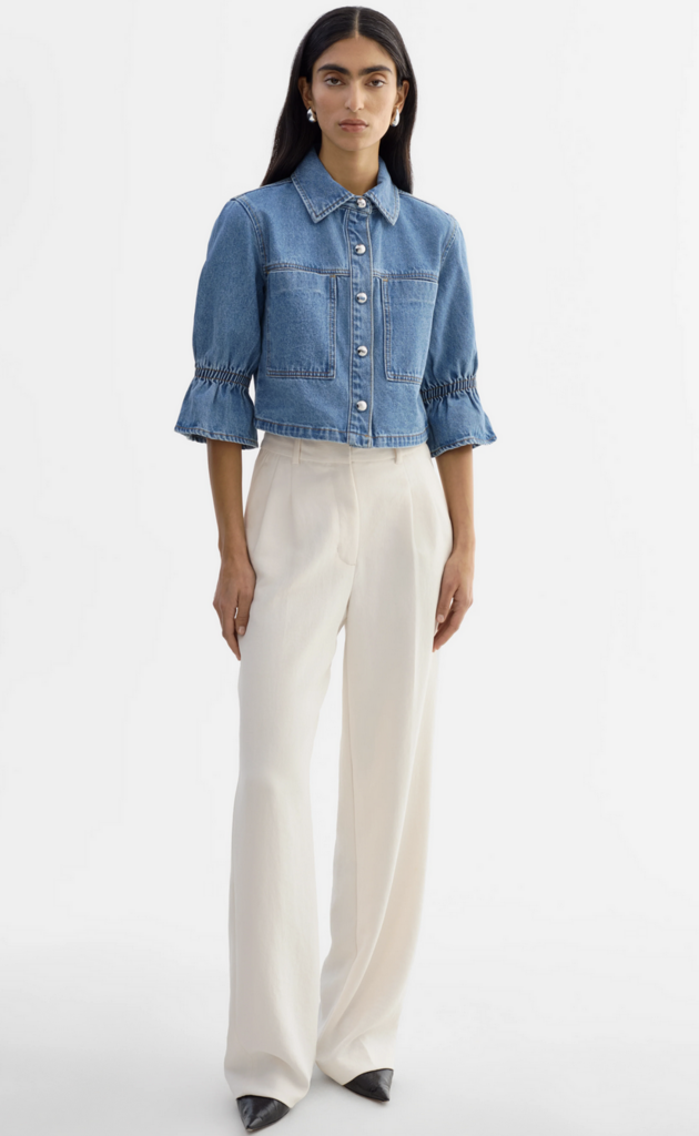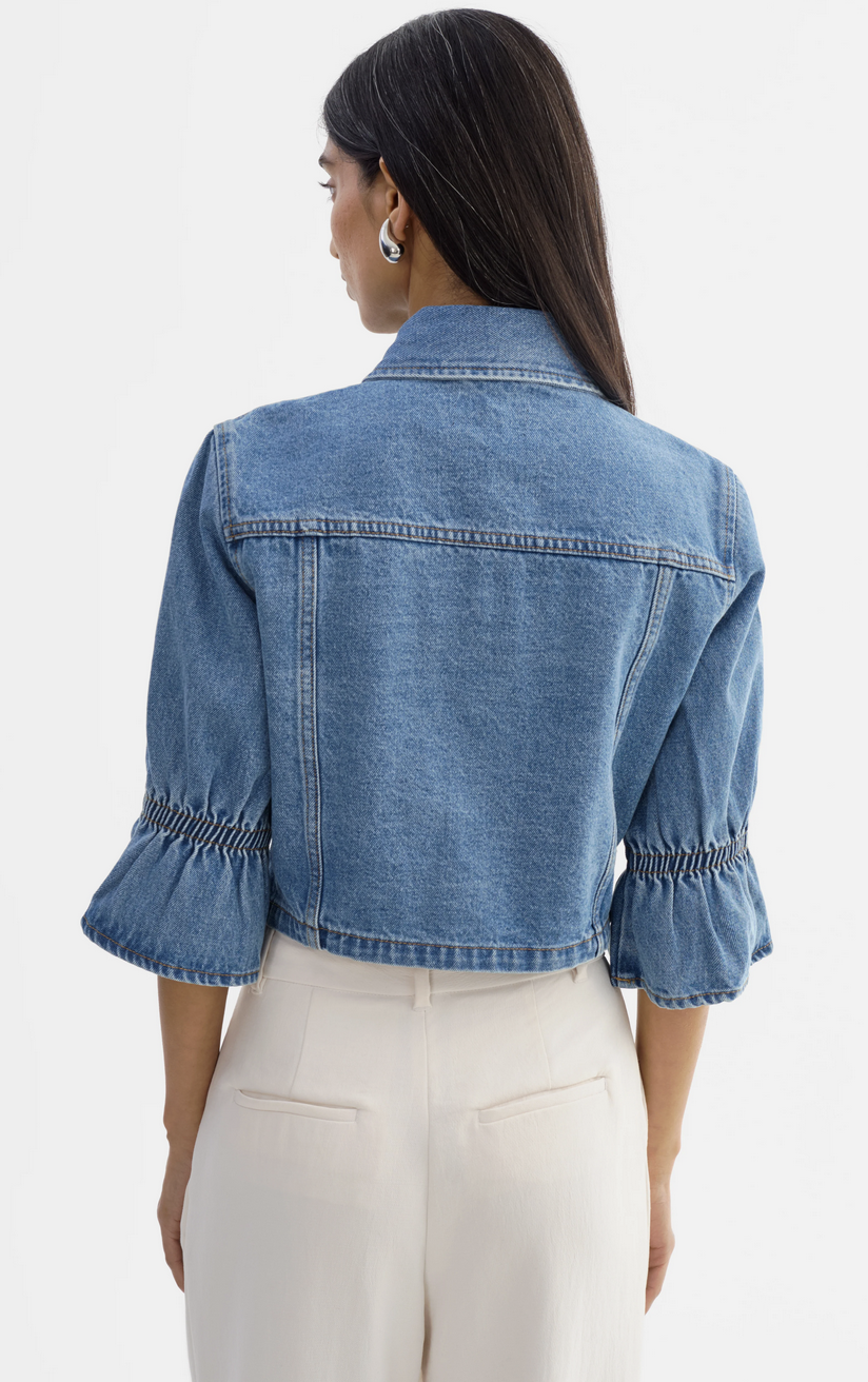 The Carolina denim jacket re-imagines a timeless staple with feminine ruffle detailing at the sleeves.Crafted in classic denim with a refined silhouette, it adds a polished, modern touch to everyday layering-effortless yet distinctive.