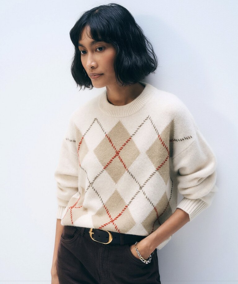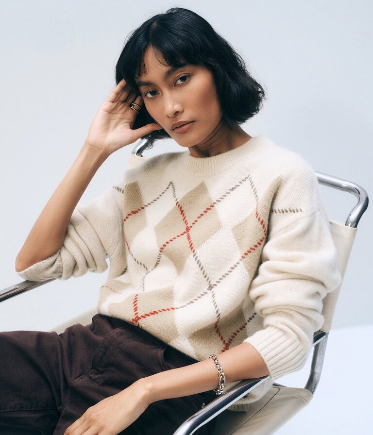 A heritage-inspired crewneck sweater knit from 100% cashmere with an intricate intarsia stitch. The modern argyle motif is perfected with hand-embroidered detailing, offering a luxurious take on a traditional silhouette.