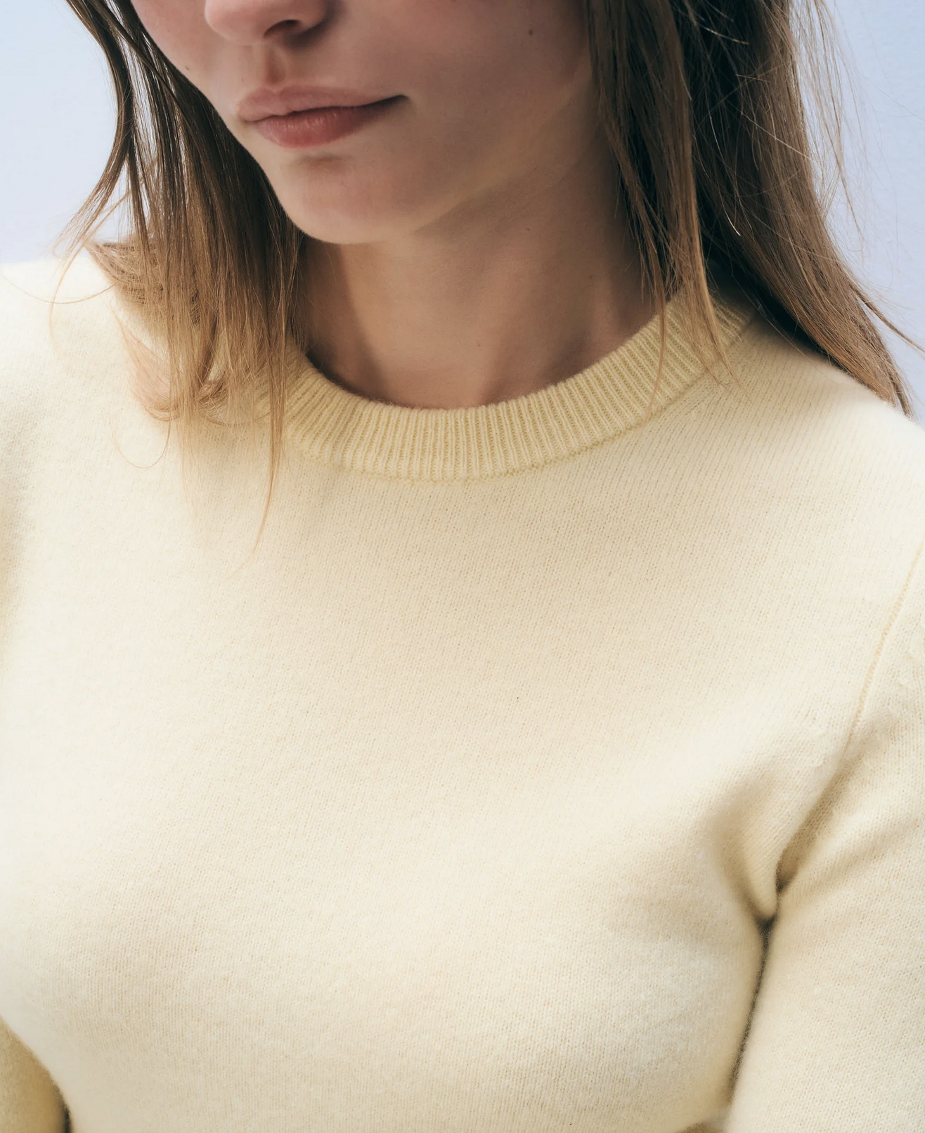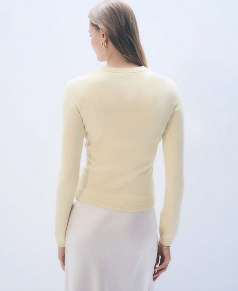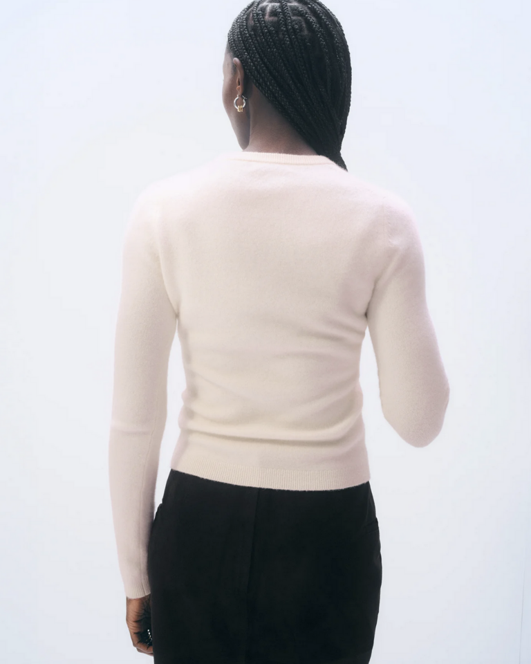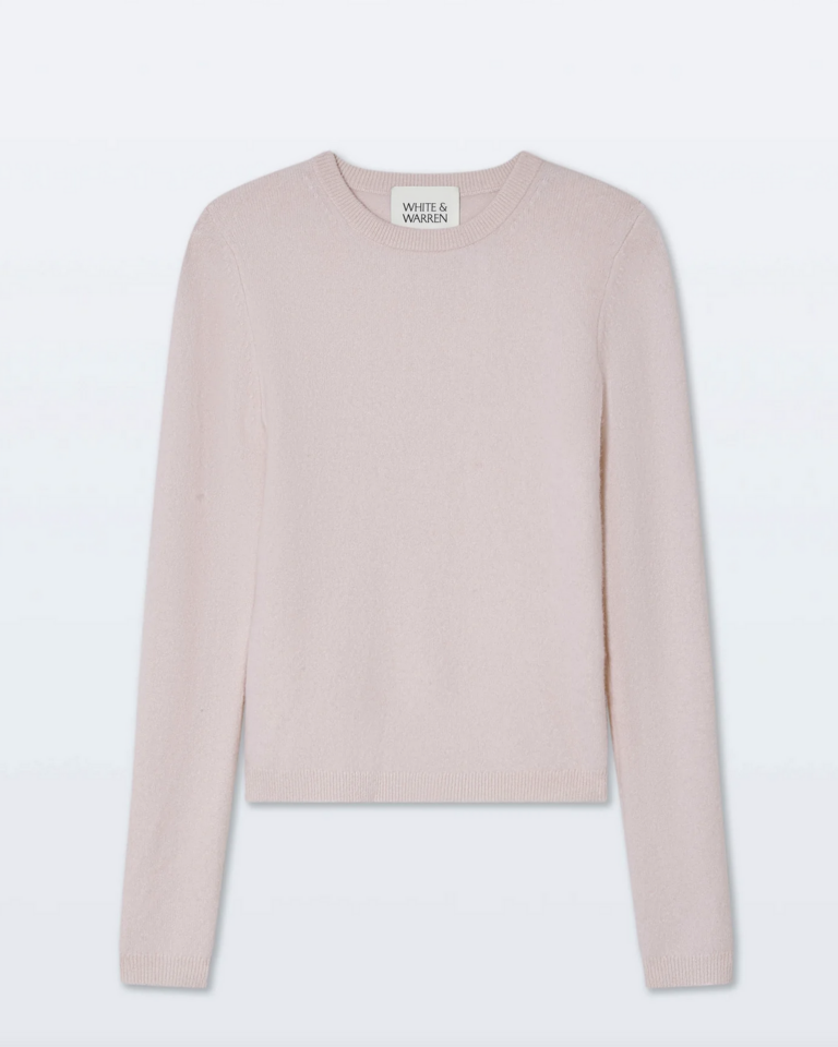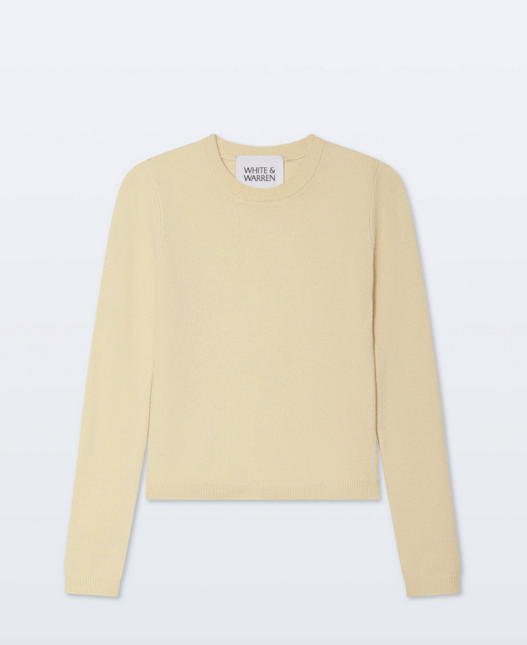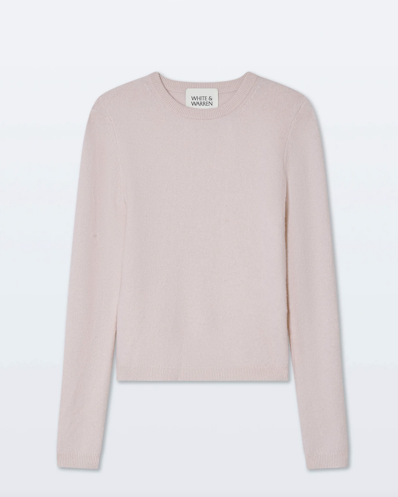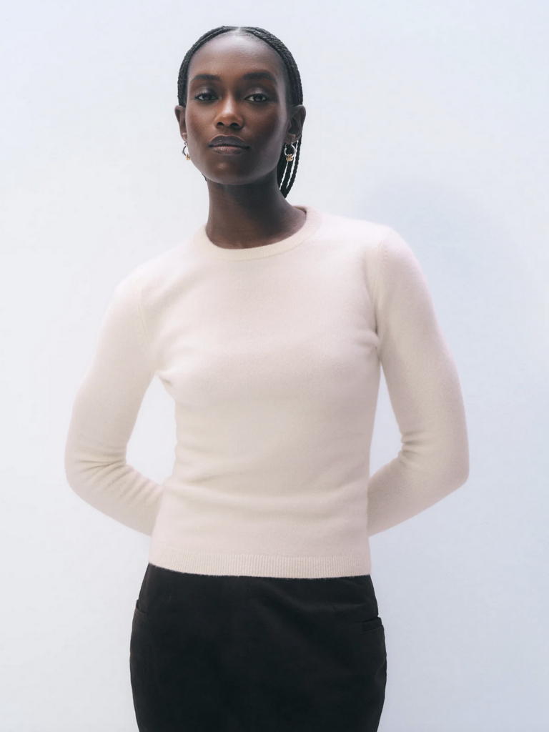Knit throughout with Lycra, this cashmere crewneck sweater is designed for a slim fit that is as comfortable as it flattering. Featuring clean ribbed trims and a high-hip length, it's versatile enough for day or night wear.