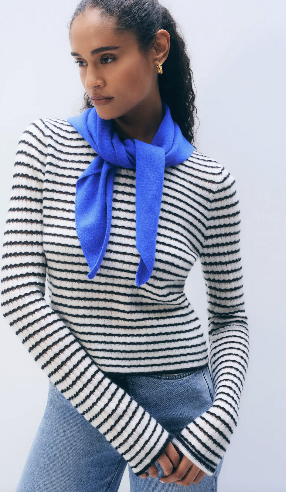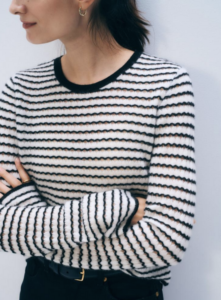 A timeless striped cashmere top by White+ Warren, crafted in ultra-soft cashmere with a classic long-sleeve silhouette. The soft black and white stripe offers an effortless, polished look-perfect for layering or wearing on its own through the seasons.