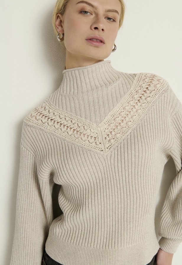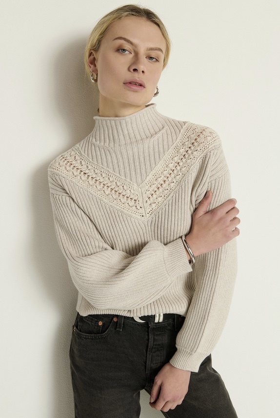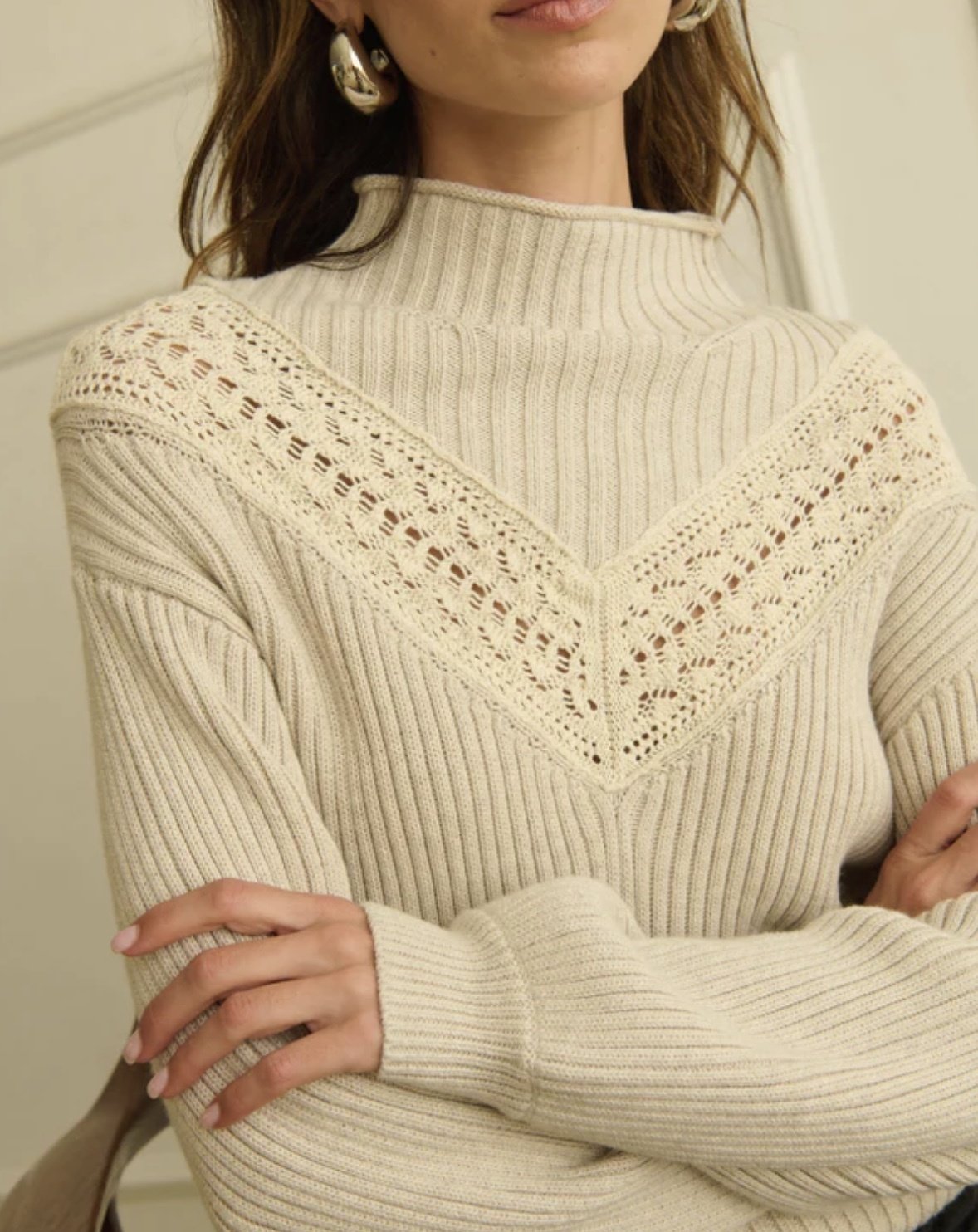 A neutral unlike any other, this long sleeve pullover has unique crochet lace details to switch up your sweater game. Knit from 100% Pima Cotton with sophisticated wide ribbing. This one comes in Heather Oatmeal.