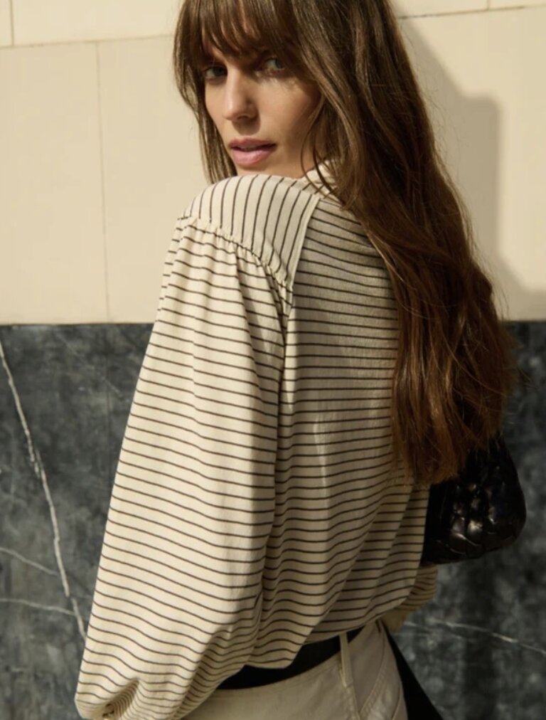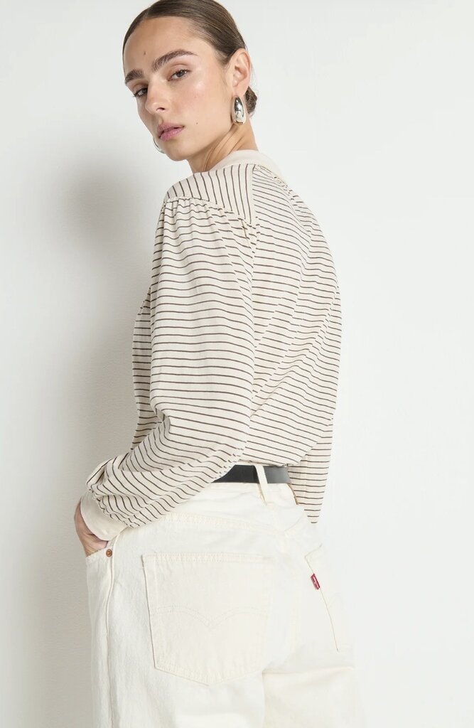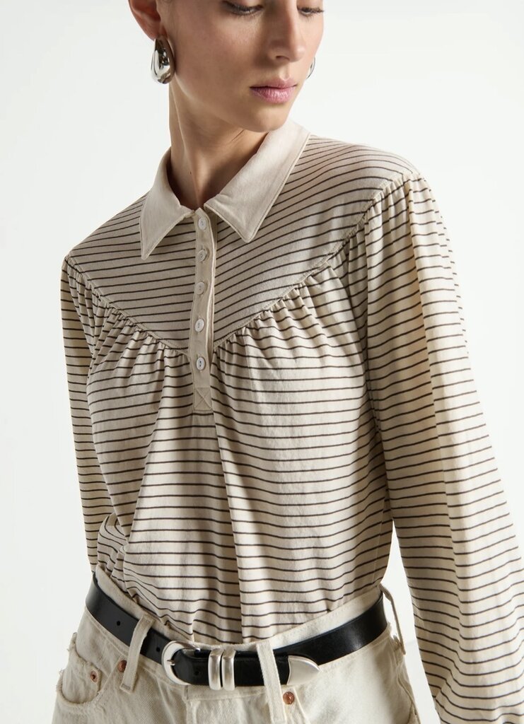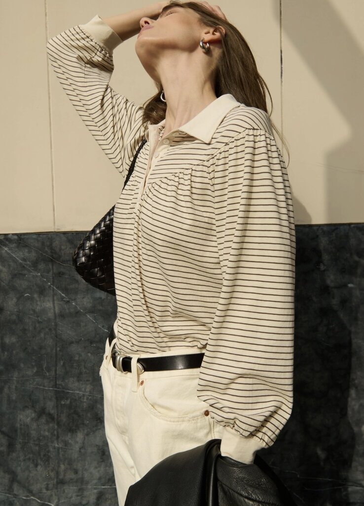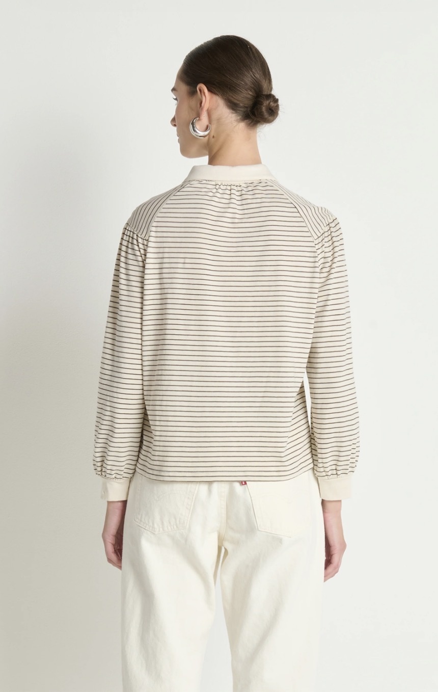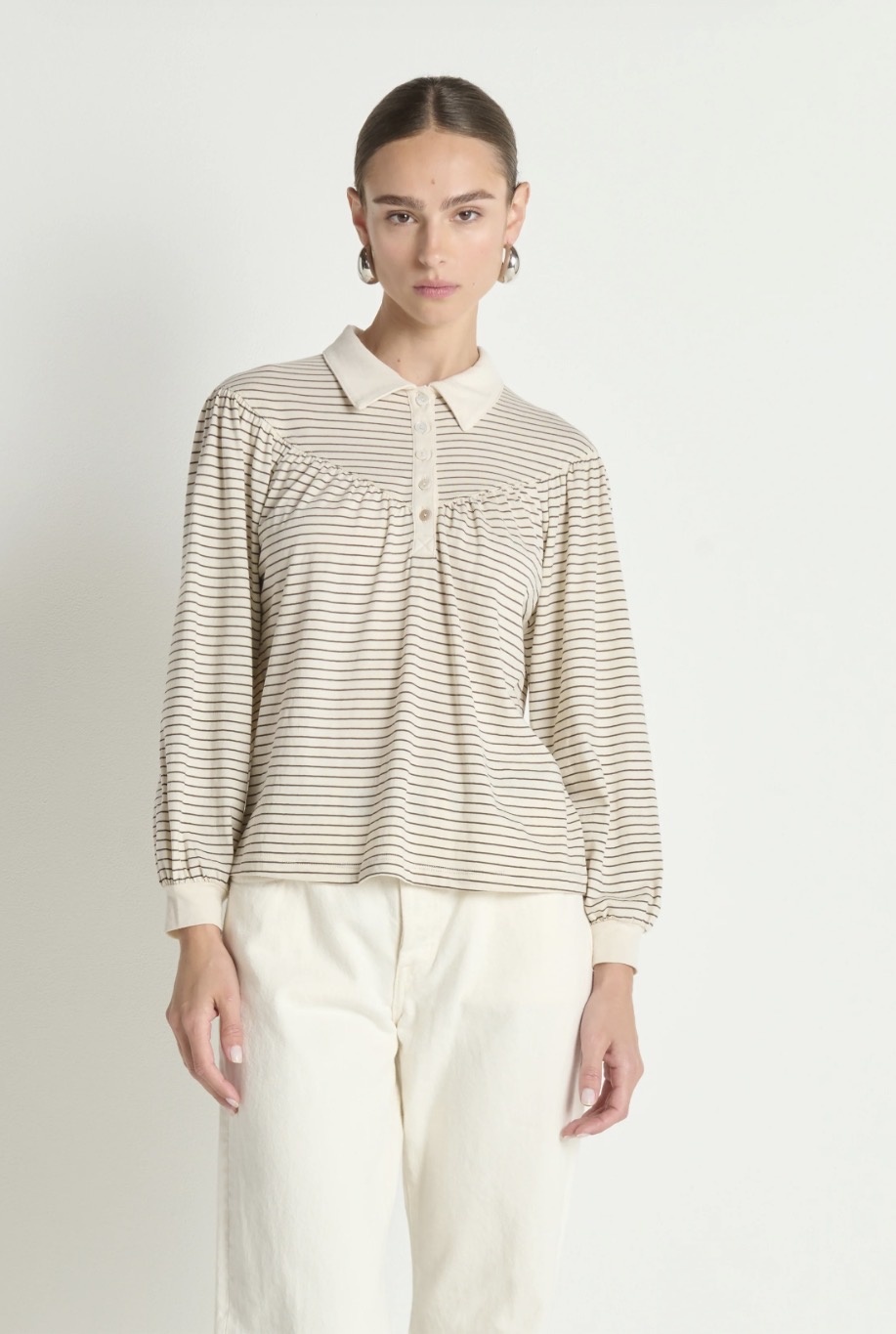 The Cecila Tee offers a feminine take on the polo. A collared neckline, shell buttons, and shirred cuffs add structure, while the easy 100% organic cotton drapes just right. This one comes in Espresso Pinstripe.