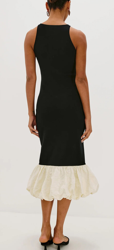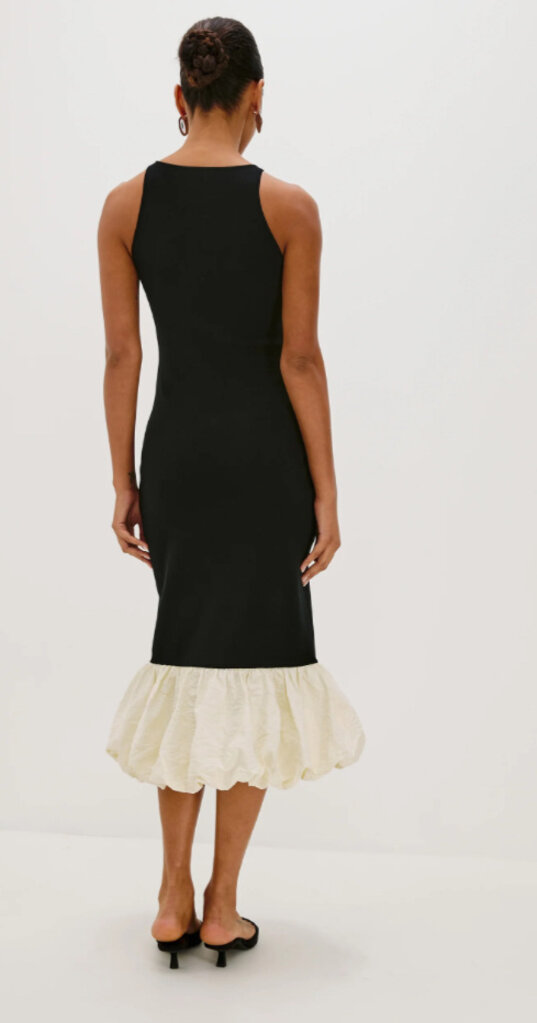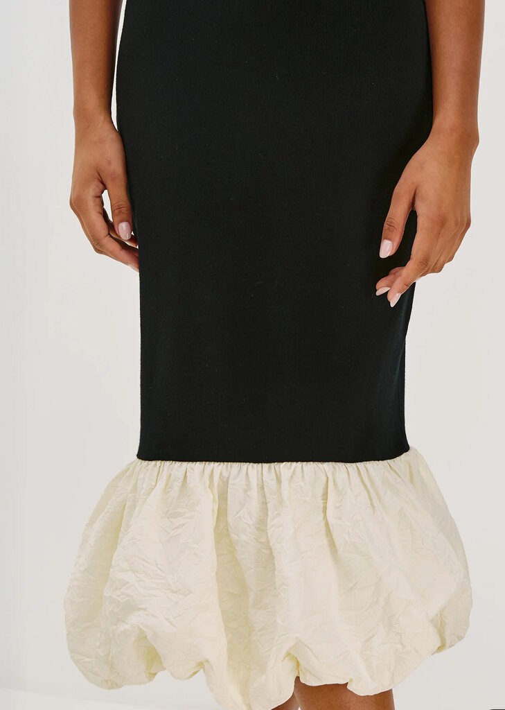 The Cheryl is a maxi-length dress with standout details. It features a fitted top crafted in a fine-gauge sweater knit and a contrast bubble hem in cotton poplin.