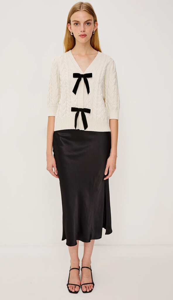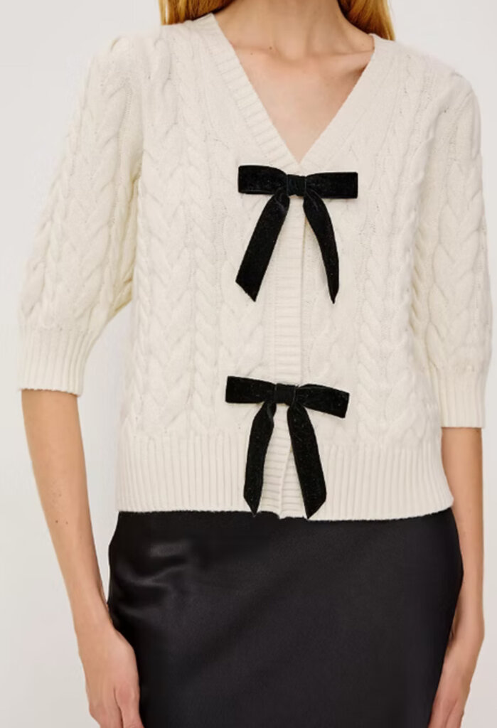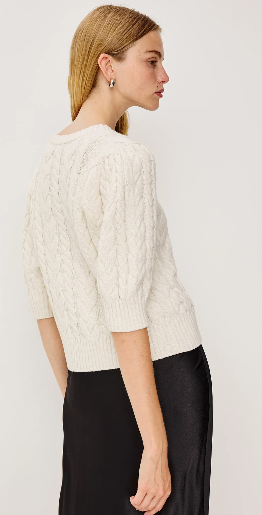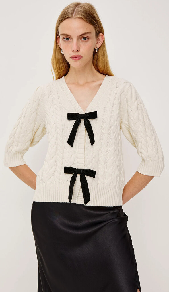 Timeless and romantic, the Clarissa celebrates elegant charm with its contrasting velvet bows. Made from a sumptuously soft cable knit, this relaxed cropped sweater features three-quarter puff sleeves and hidden snap closures at the front.