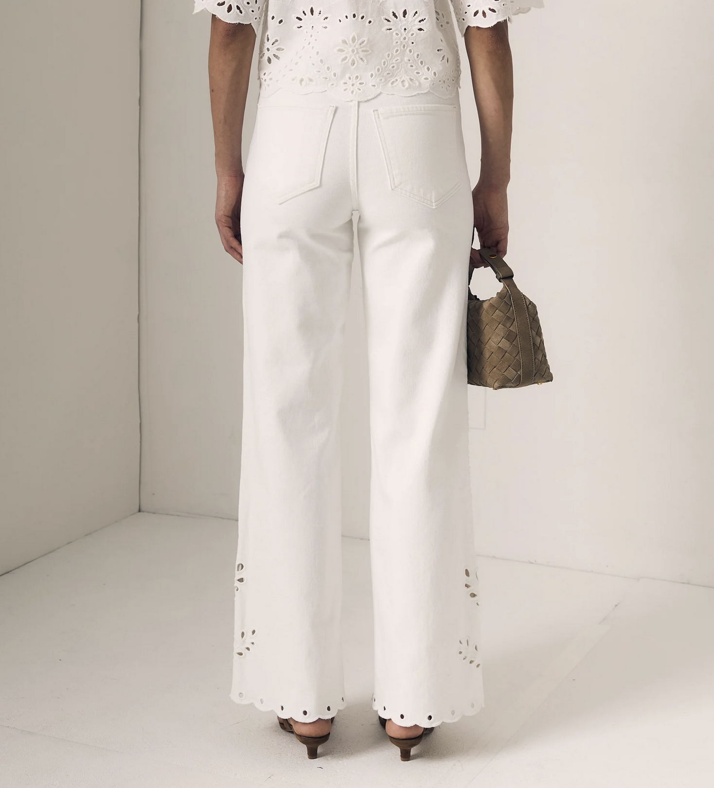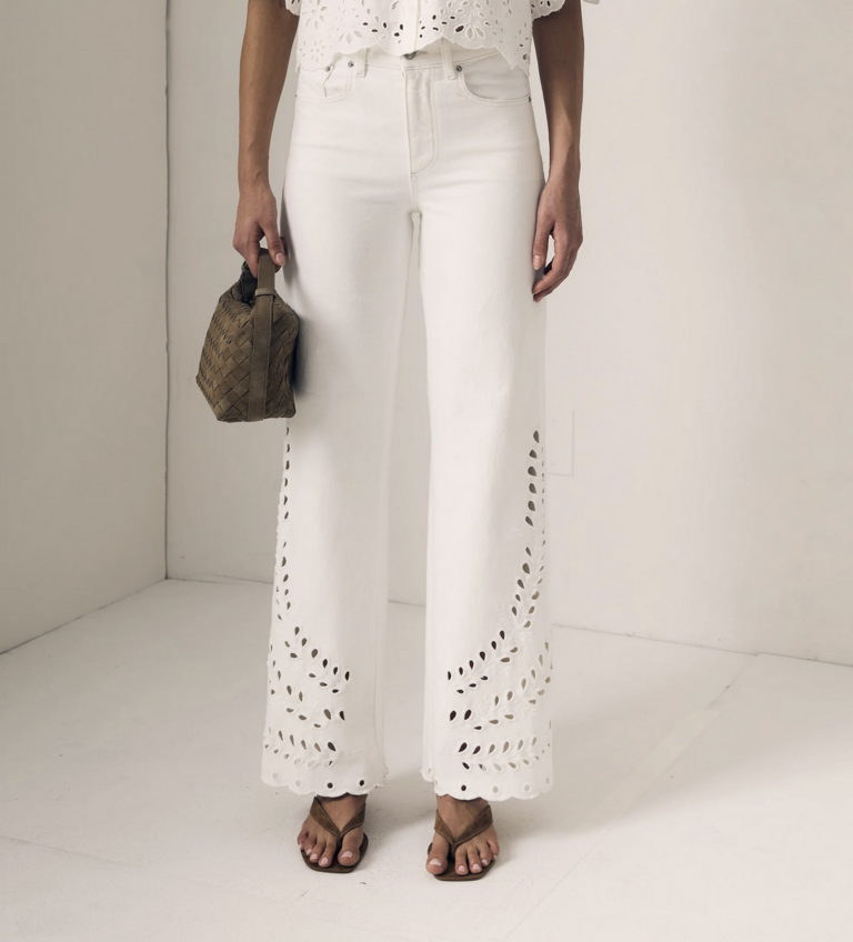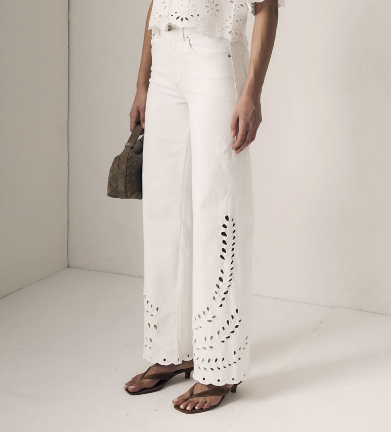 A high-rise column jean with delicate eyelet detailing, offering a feminine update to a classic straight-leg silhouette. Clean, elongating, and effortlessly versatile for everyday wear.