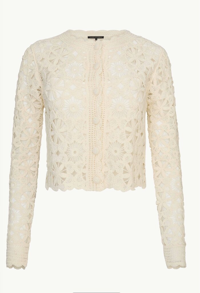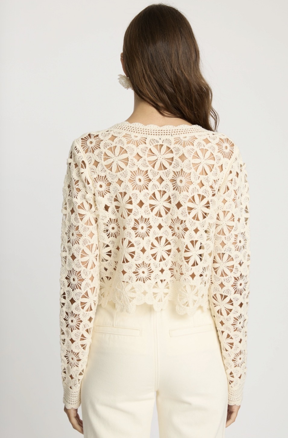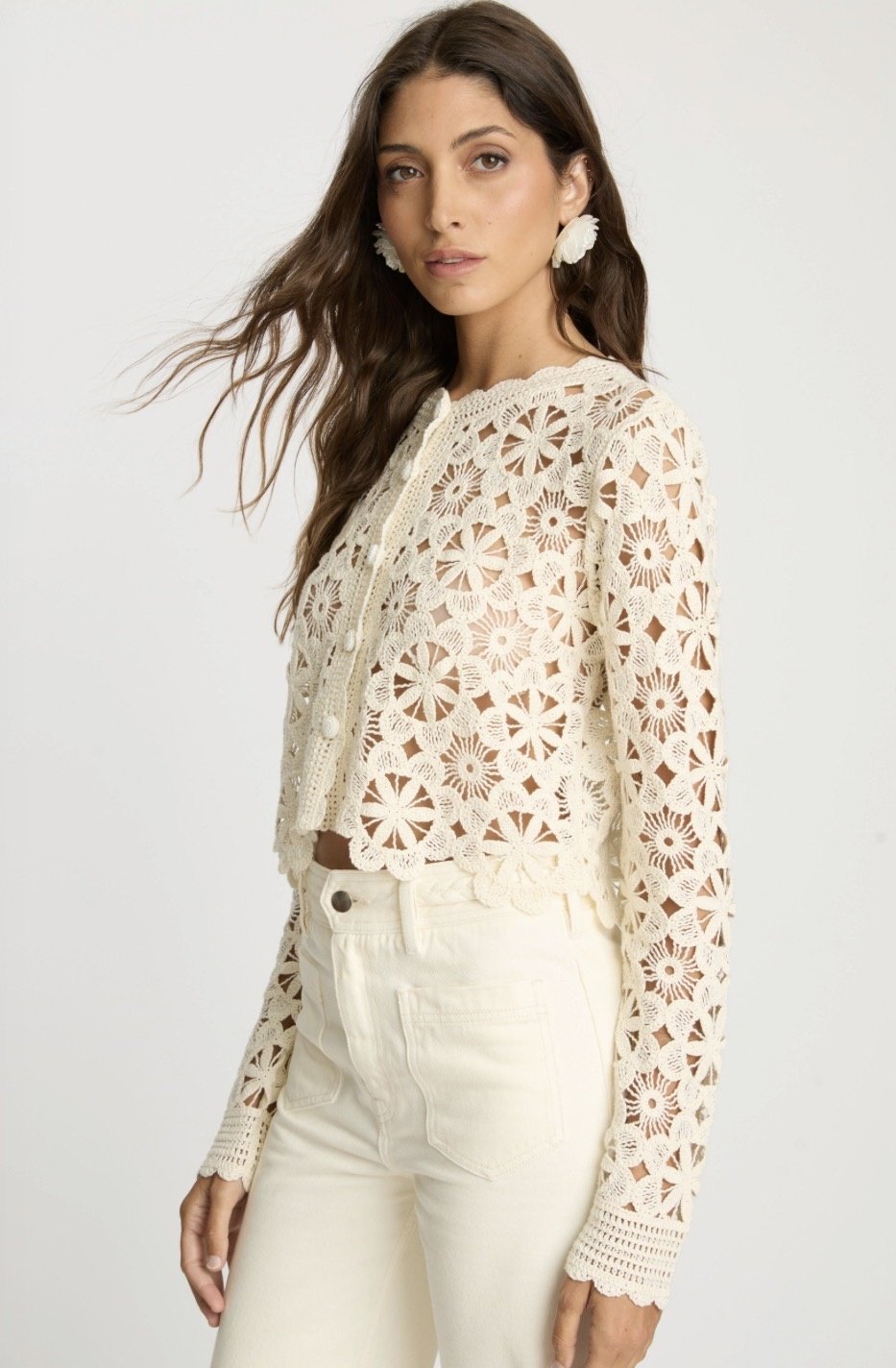 The Corina Sweater in cream is a statement layering piece crafted with intricate floral crochet detailing throughout. Designed with a lightweight, open-knit construction, it features long sleeves and a softly cropped silhouette that feels both feminine and modern.