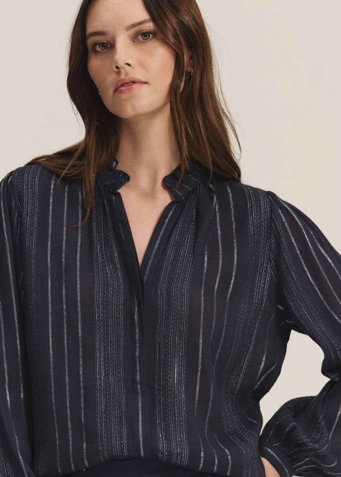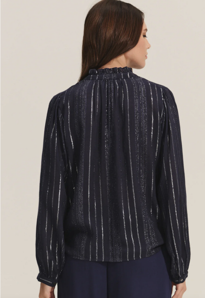 Light and refined, this viscose top features subtle lurex weaving for a soft metallic shimmer that catches the light. Designed with a gentle V-neckline, self-covered button placket, and delicate ruffle detailing along the neckline, this top brings an effortlessly chic touch to any look.