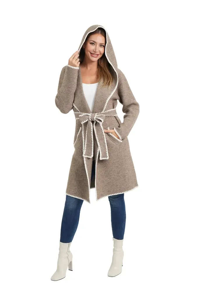 Dale wrap cardigan with embroidery, shawl collar, open front, front welp pockets, wrap belt, embroidery detail, relaxed fit.