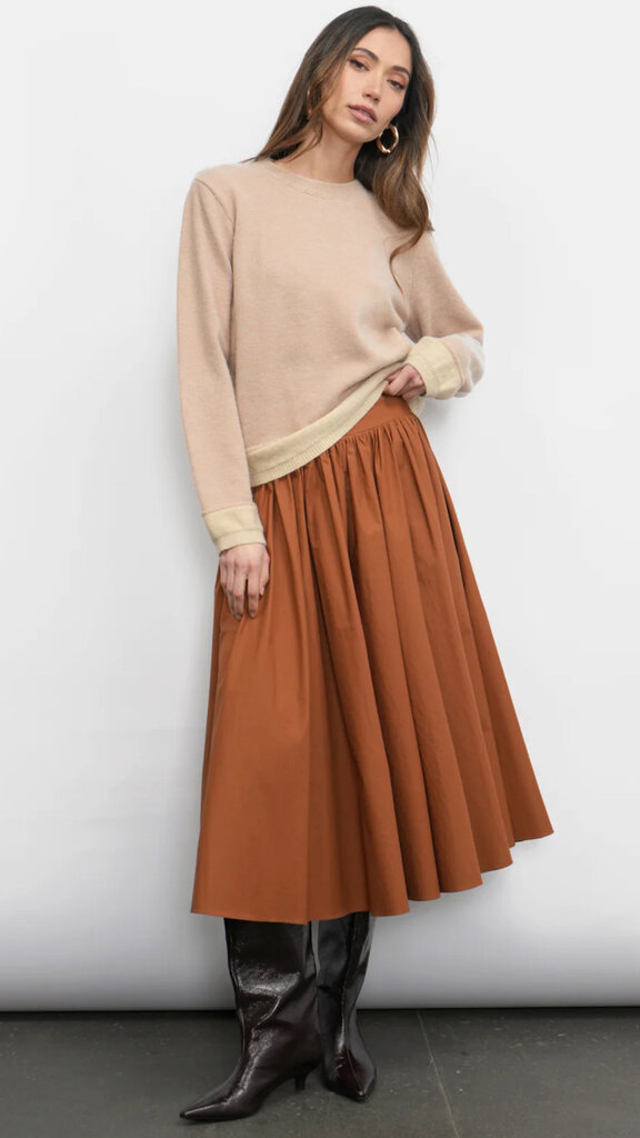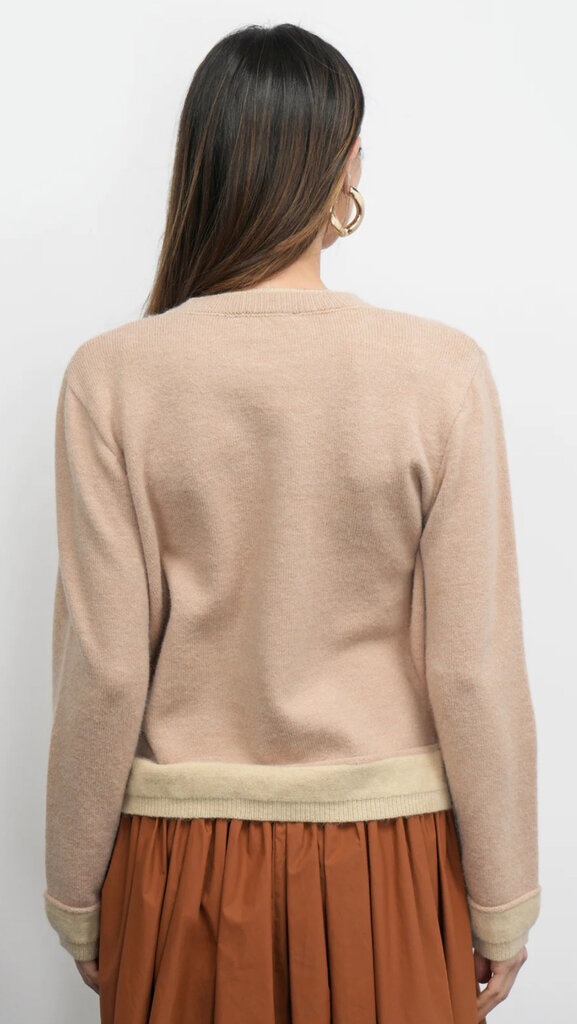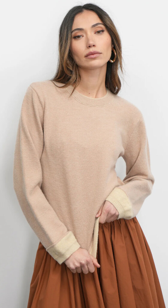 It features a classic crew neckline and a relaxed fit, made distinctive by its sophisticated two-toned design: a subtle, lighter contrasting hue graces the ribbed cuffs, adding a refined touch to the overall warm beige or camel tone.