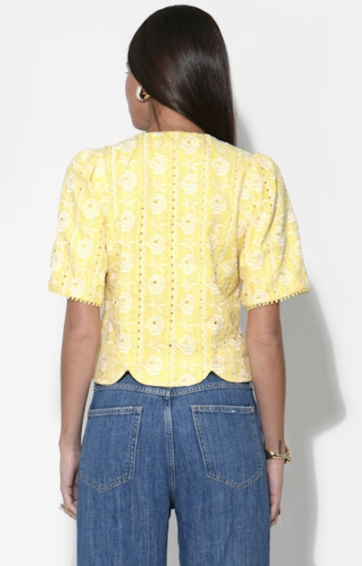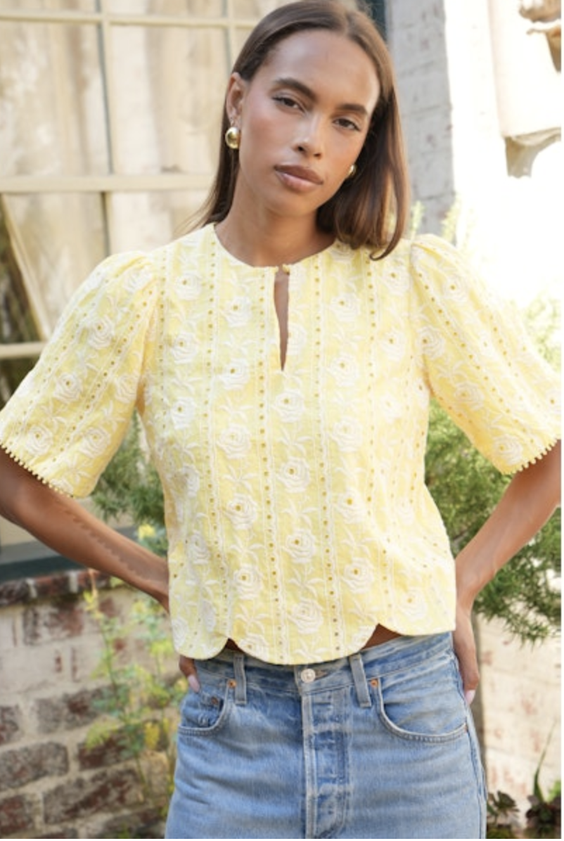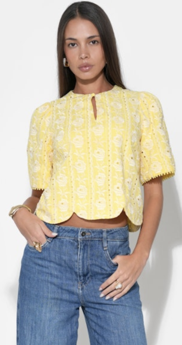 This top is all about the details. Rendered in a cheerful, vibrant Yellow, it features intricate floral embroidery that adds a beautiful, raised texture and an artisanal feel.