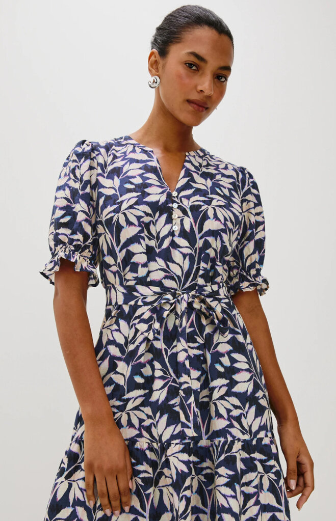 The Eliana dress features a ruffle hem and shirred short sleeves, cut from autumnal-printed crinkle cotton poplin for a free-flowing silhouette.