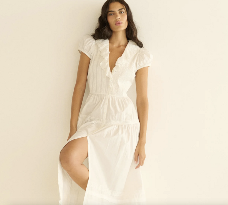 Cut from crisp organic cotton poplin, the Eliette Dress draws on some of our favorite vintage references. An eyelet-trimmed ruffle frames the V-neckline, while clustered pintucks lend texture to the fitted bodice.