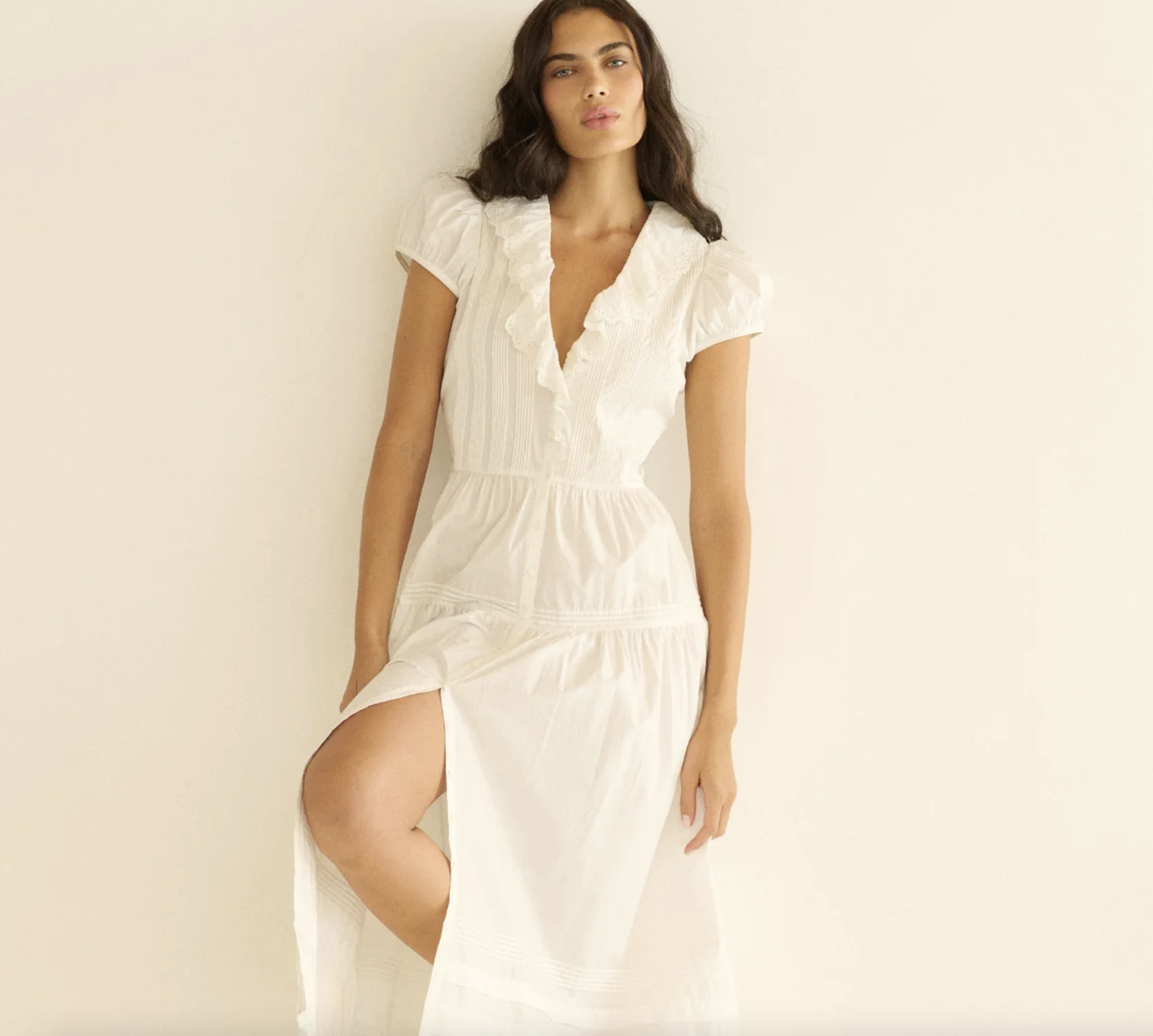The tiered, ankle-grazing skirt recalls our beloved Sebastiane, finished with pintucks and scalloped eyelets along the hem. A line of mother-of-pearl buttons down the center front can be worn fully closed or slightly undone.