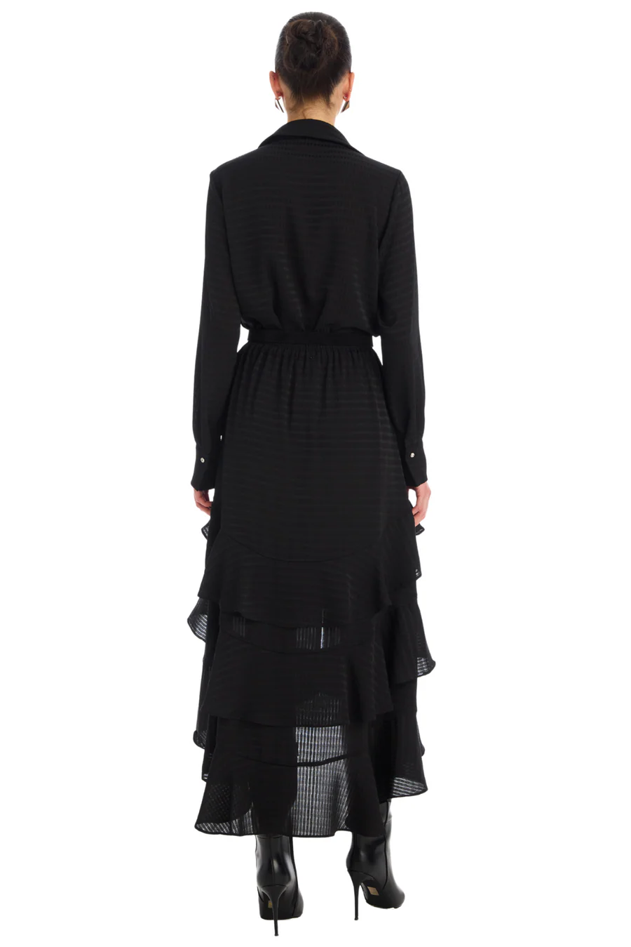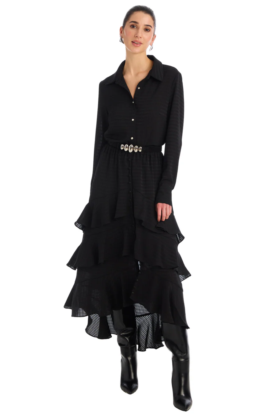 Our Best Selling Ella Skirt is back in a textured solid fabrication. Designed with cascading ruffles and working buttons down the center front. An elastic waist makes for an easy pull-on style. Fully lined.