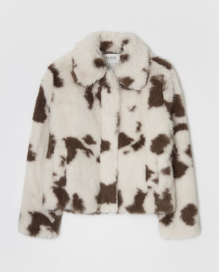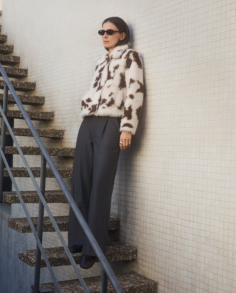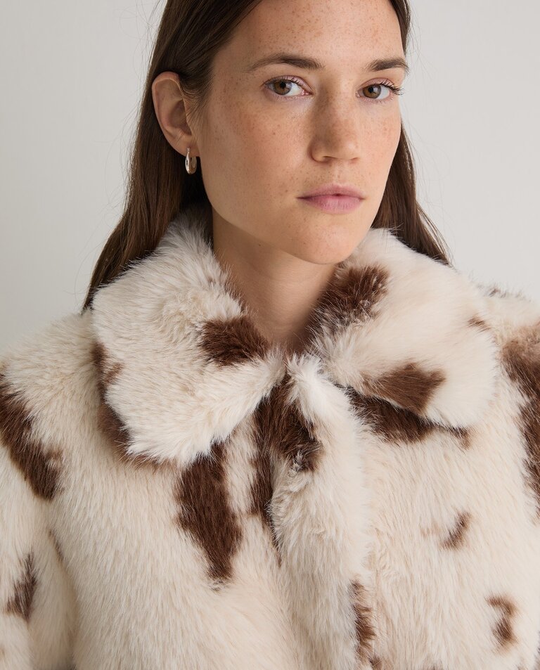 Short regular-fit coat. Faux fur. With lining. Animal print. Collar. Long sleeves. Zip and snap fastening. Two side pockets.