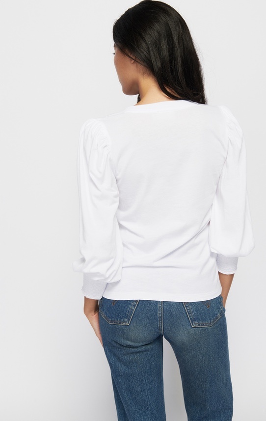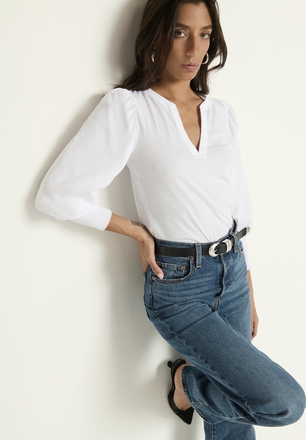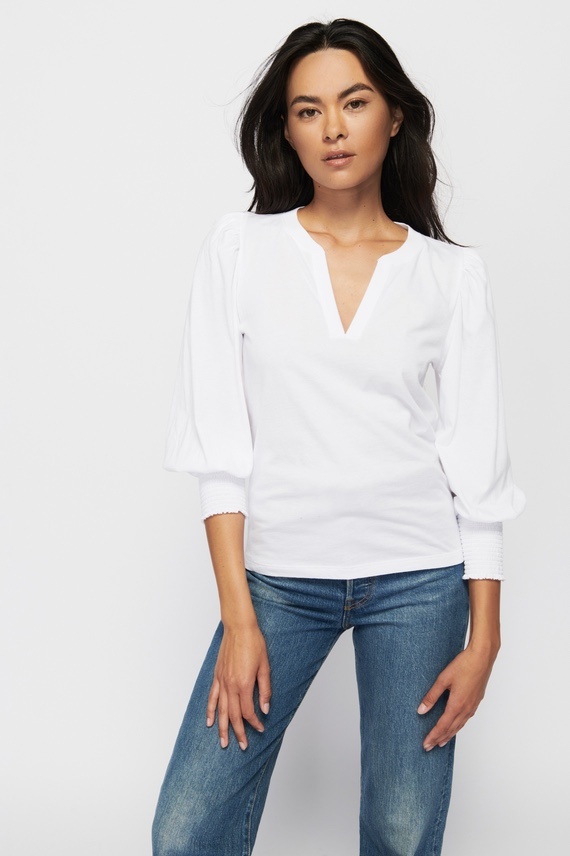 When your favorite features of the Loren tee (the exaggerated shoulders, the chic smocked cuffs) meet the ease of a notched neckline, you get your new go-to for… everywhere.