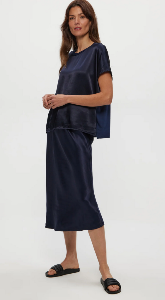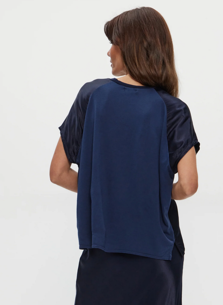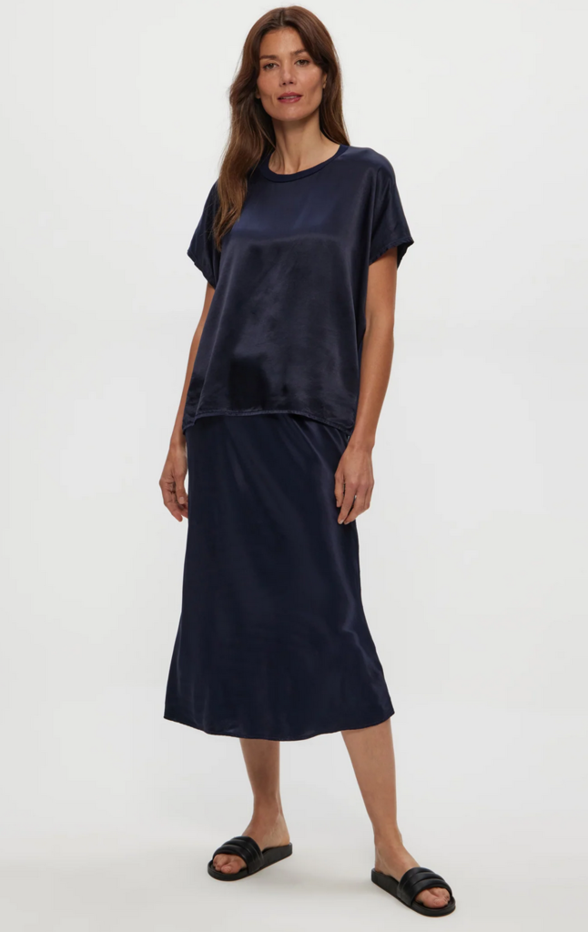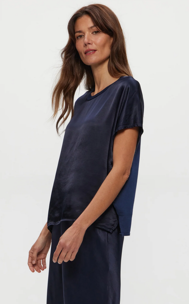 Designed from our luxe washable satin, this easy fitting tee has a crewneck, short sleeves and a contrast cotton back. Pair this tee back to the Cyrus Pant or the Pixie Jogger for the perfect quiet luxury look.