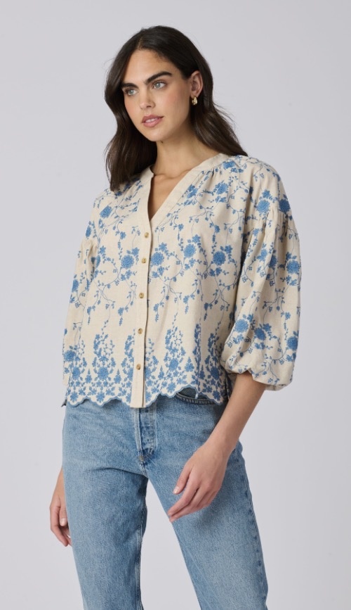 A romantic blouse featuring a soft v-neckline, delicate button-front detailing, and airy puff sleeves. Finished with subtle scalloped edging and an allover floral print for effortless everyday charm.