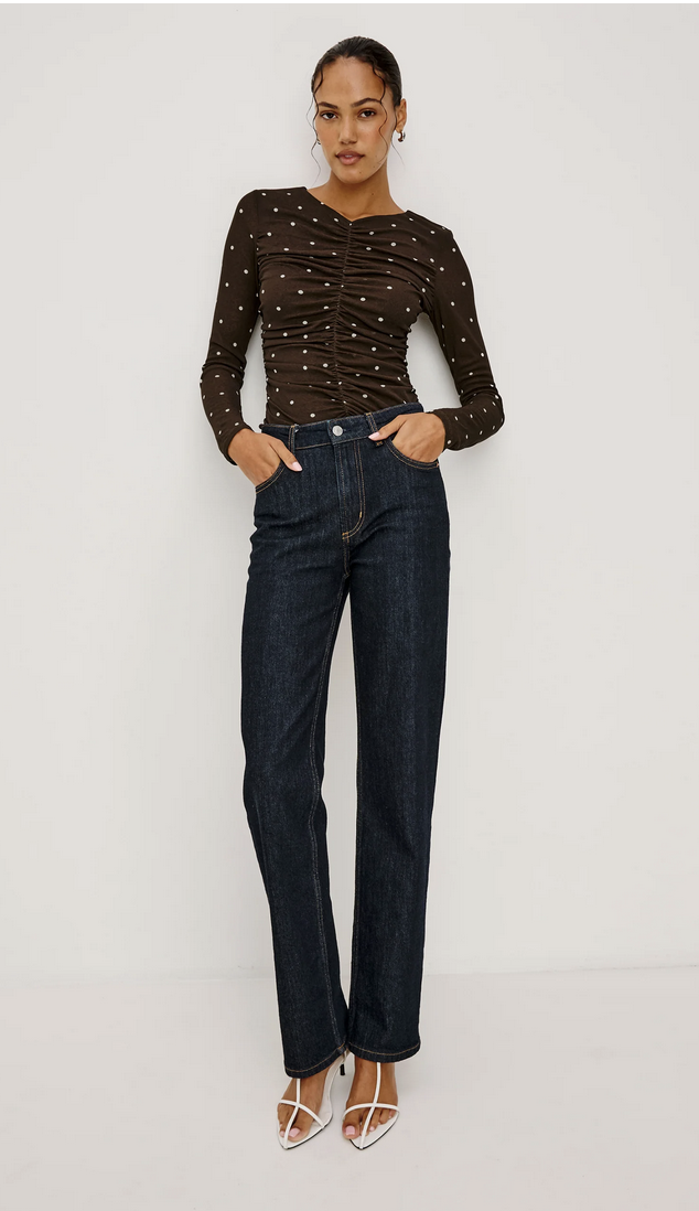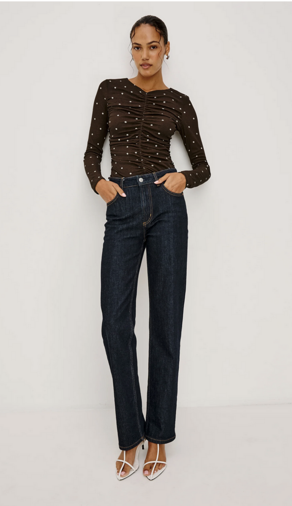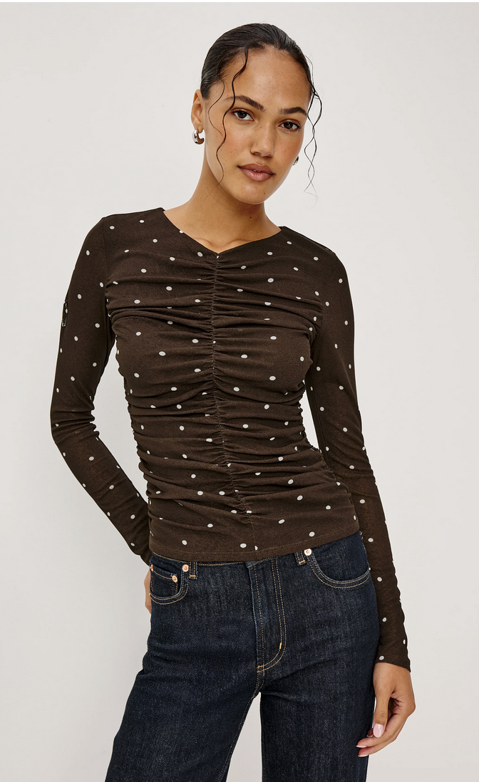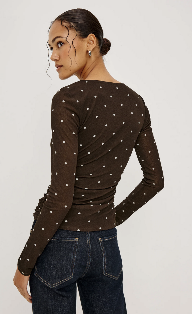 Effortlessly sophisticated with a playful twist, the Georgina features an allover polka dot print on mesh with a subtle V-neckline.