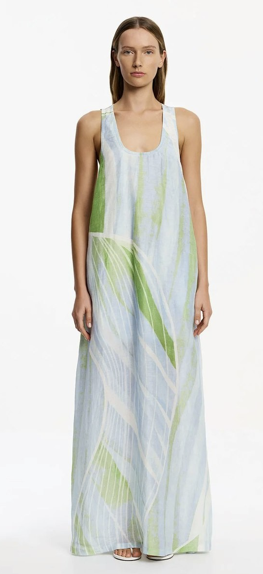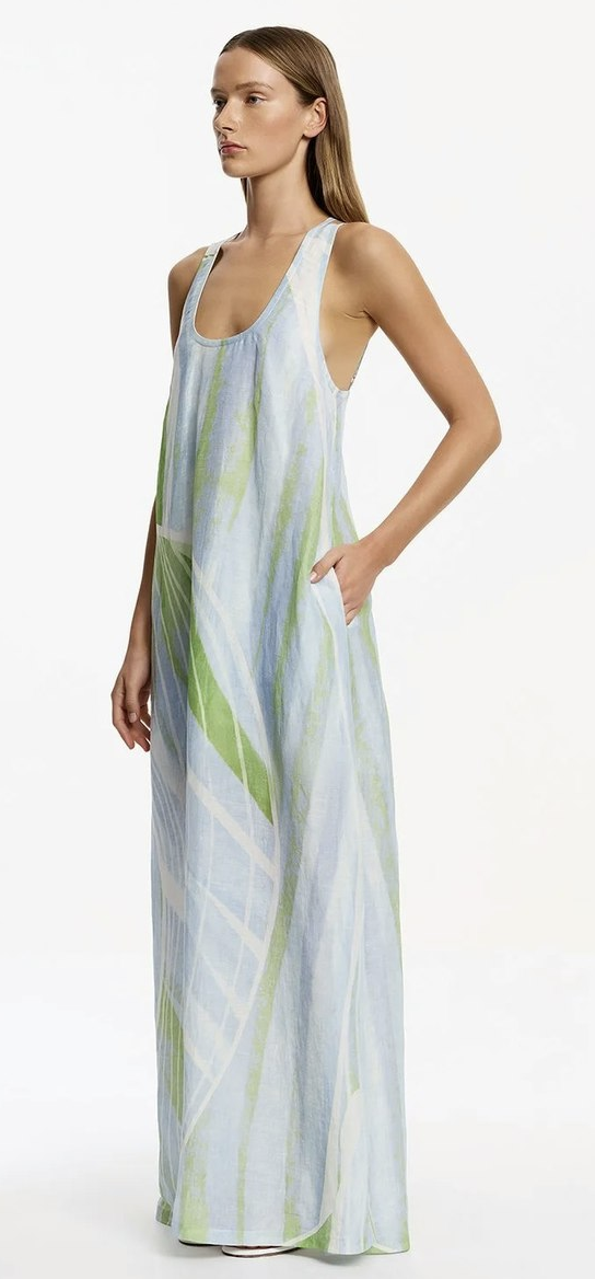 The Giorgie Maxi Dress in Seascape commands attention with its elongated silhouette and artful placement print, capturing the essence of effortless dressing. Meticulously crafted from lightweight fabrication, this dress features adjustable straps, a pull-on design, and side seam pockets for contemporary versatility. A mini-length lining ensures coverage, while the fresh print lends a sense of modern artistry.