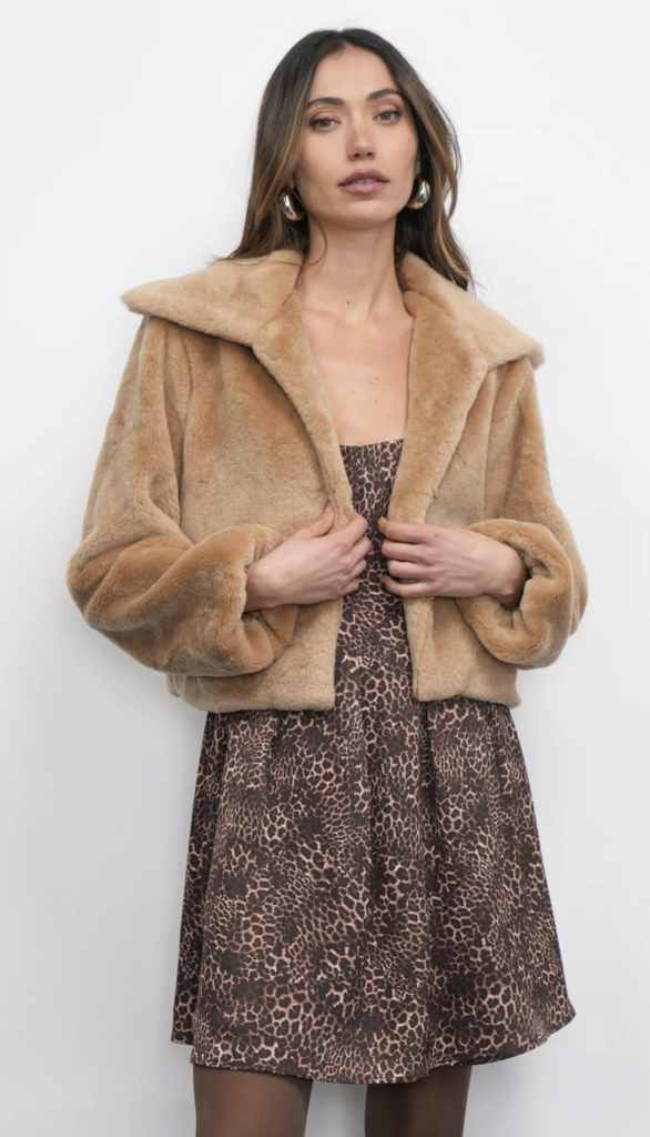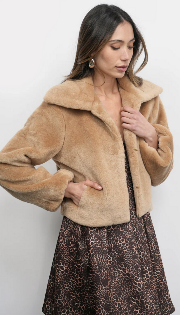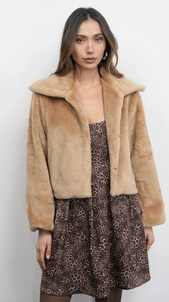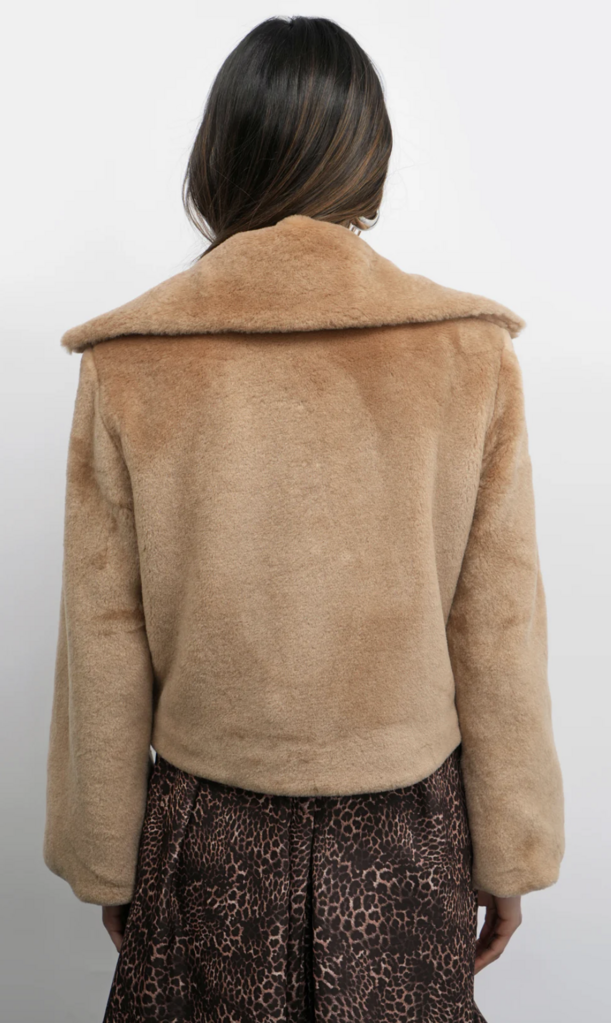 This coat is crafted from a soft, plush faux fur material in a rich biscotti color. It features an oversized silhouette that drapes elegantly over the body.