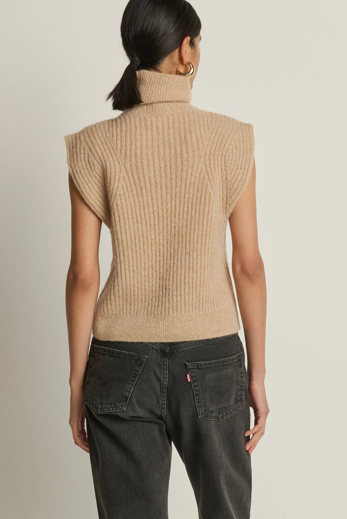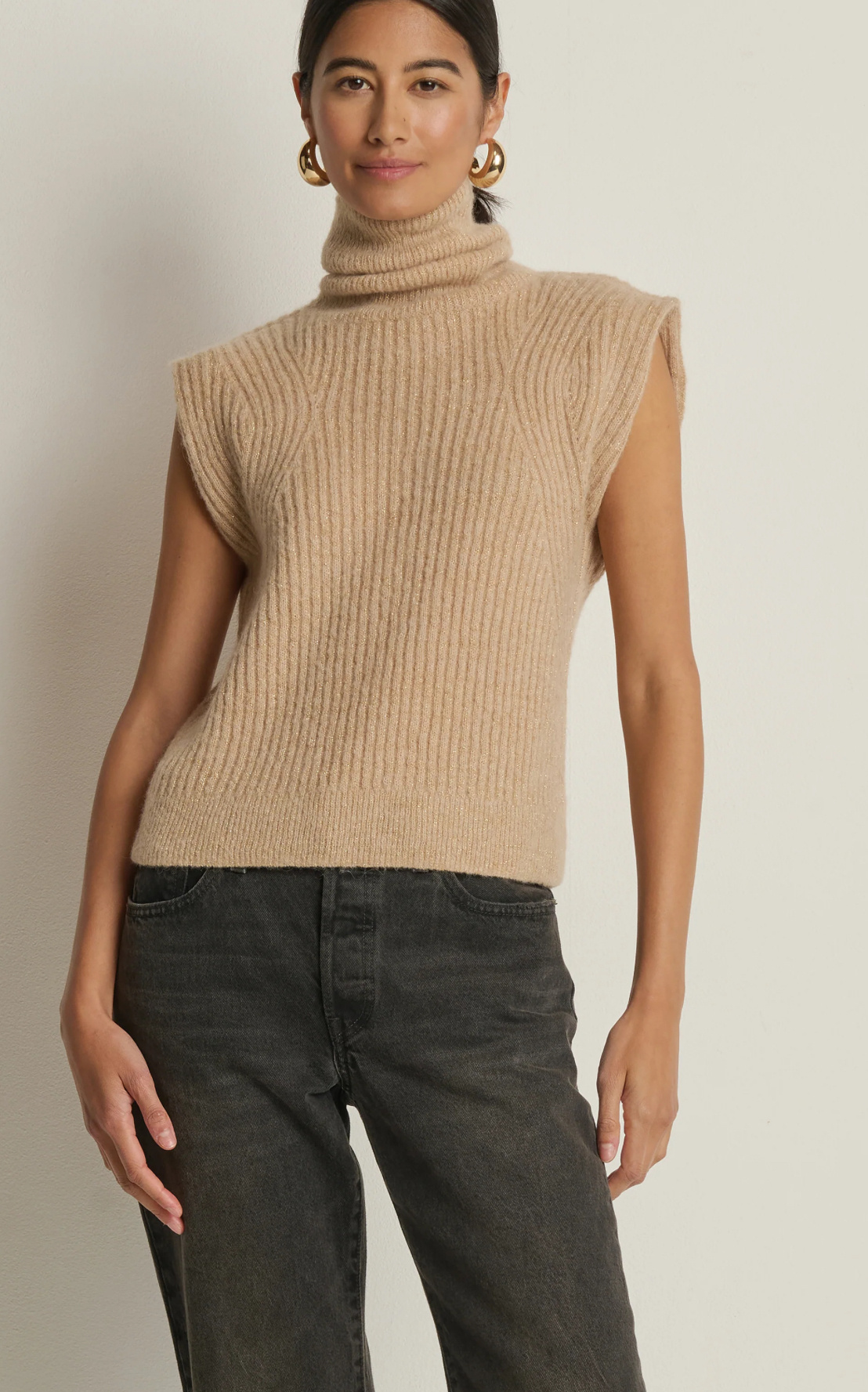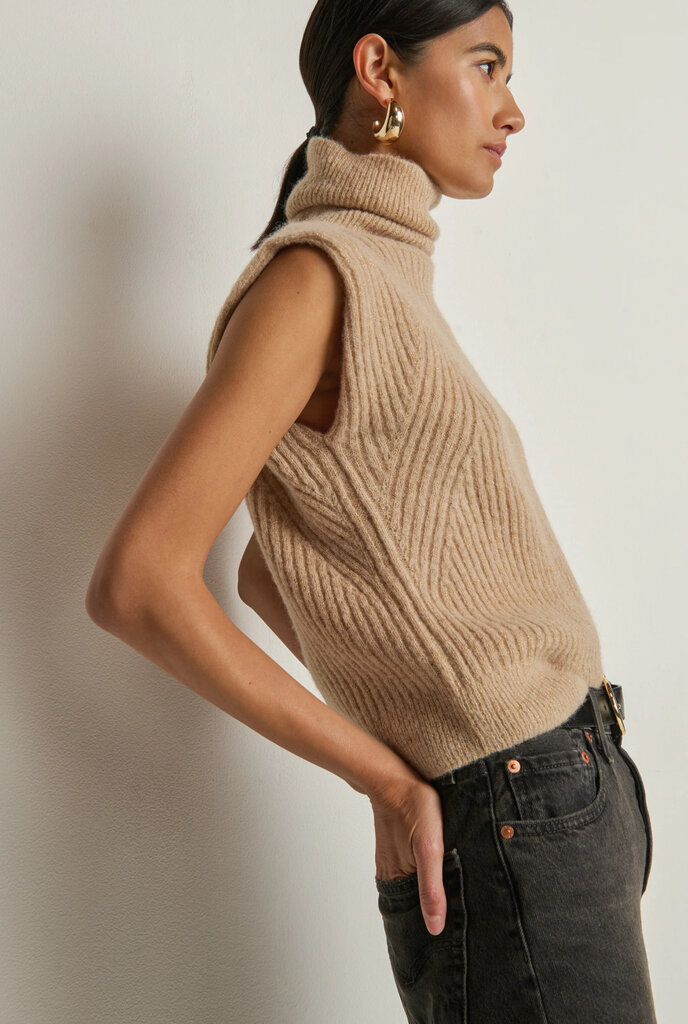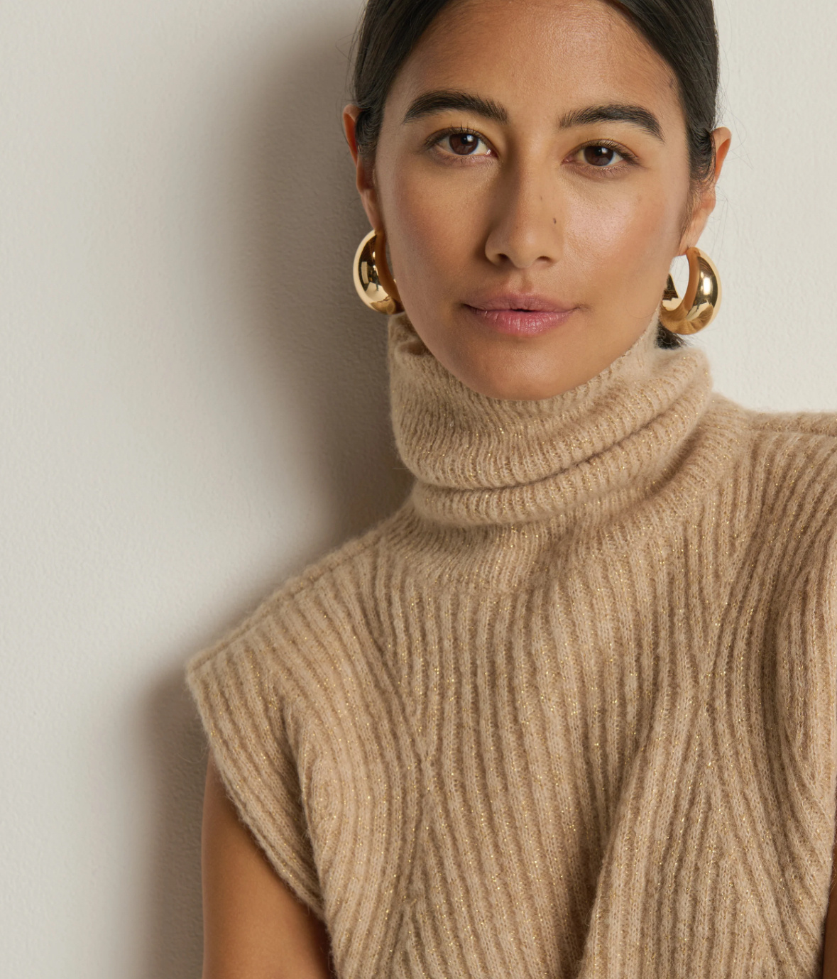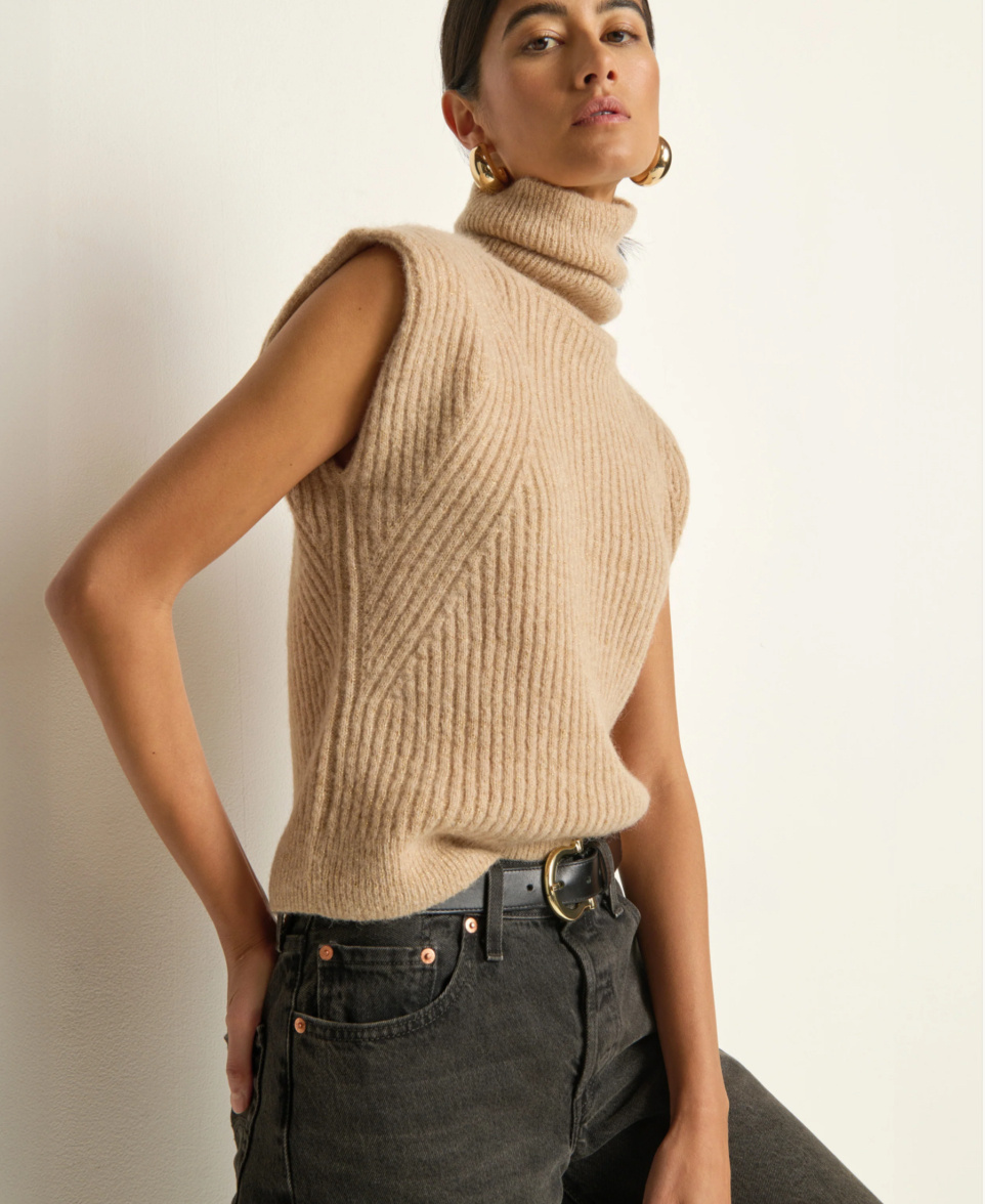 The Isha Turtleneck Tank plays it cool with quiet texture and undeniable presence. Knit from alpaca yarn in our signature fit, its ribbed pattern adds subtle depth, while the turtleneck and sleeveless turnback shoulders bring soft structure with a hint of edge—plus just enough warmth, with none of the bulk.